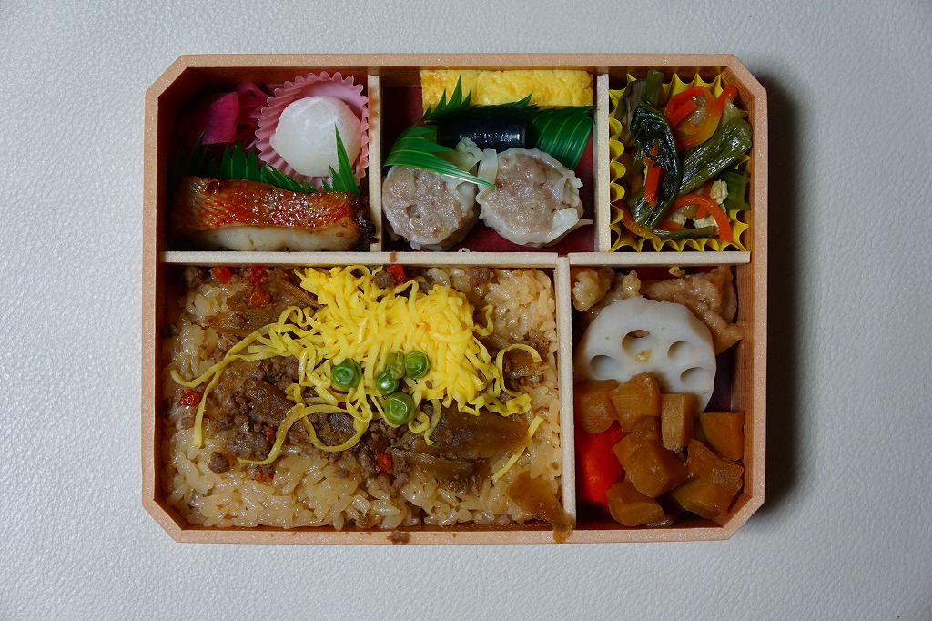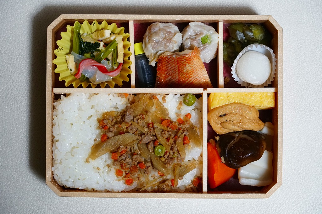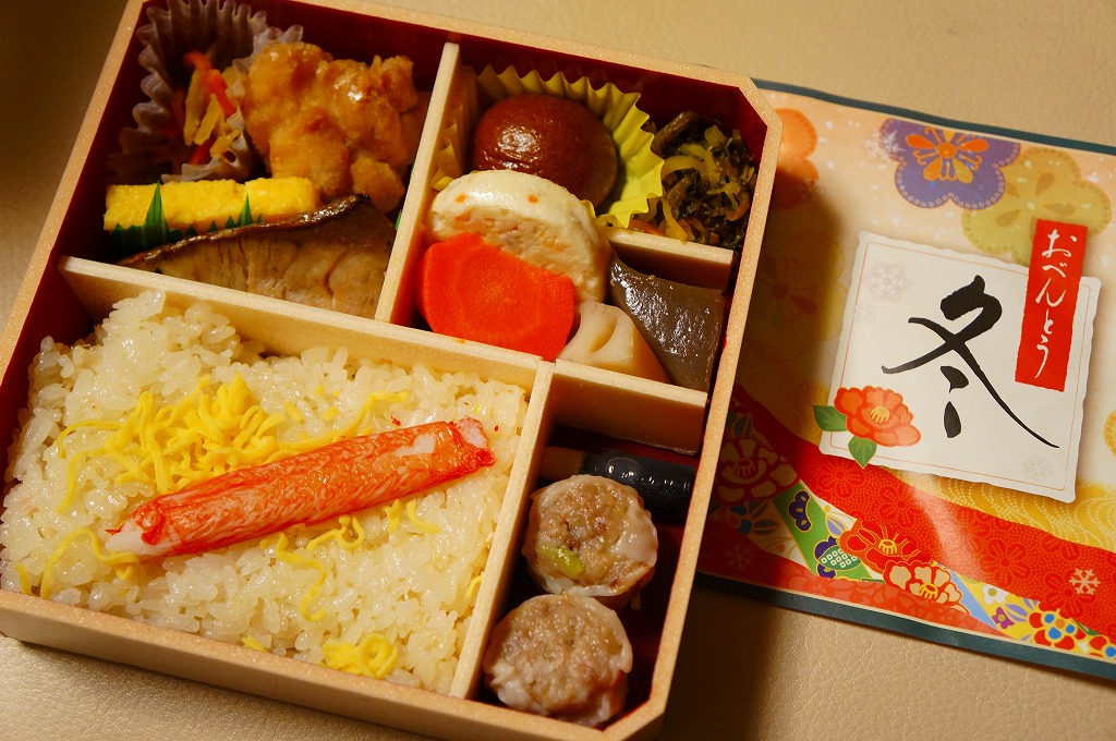 2003(平成15)年12月に初めて販売した、横浜駅の冬駅弁「おべんとう冬」の2019(令和元)年版で、12月1日から1月31日までの販売。今回も印象は似るが中身は少し変わり、牛そぼろとごぼうの甘辛煮の茶飯に、赤魚の酒塩焼き、野菜のしんじょう、こおりこんにゃくと小松菜とカニ風味蒲鉾と油揚げの和え物、レンコンとニンジンの煮物、タケノコ煮、玉子焼、しば大根漬け、小粒大福、シウマイ2個。