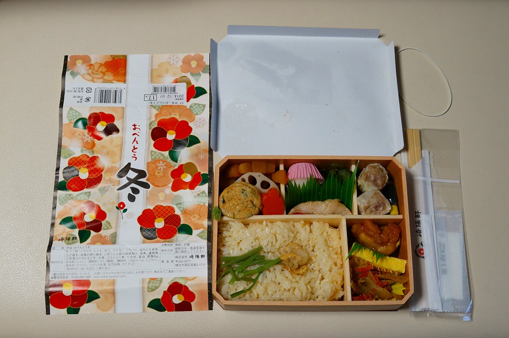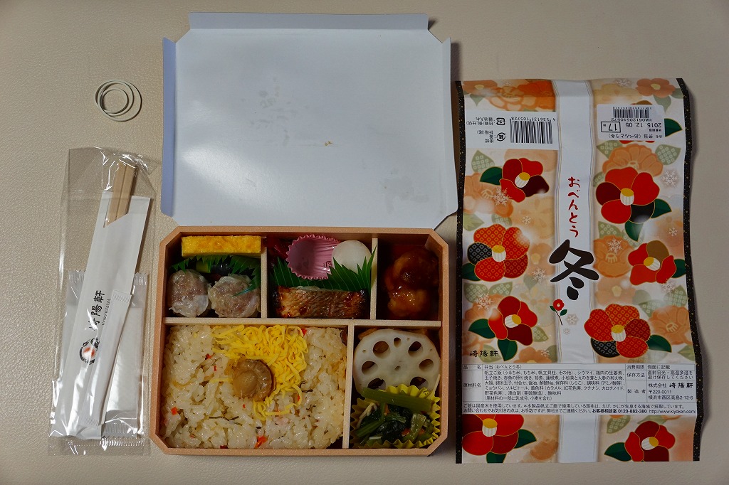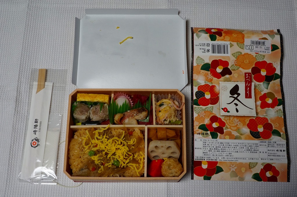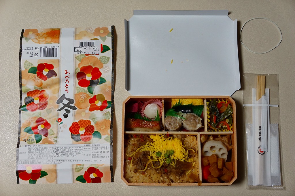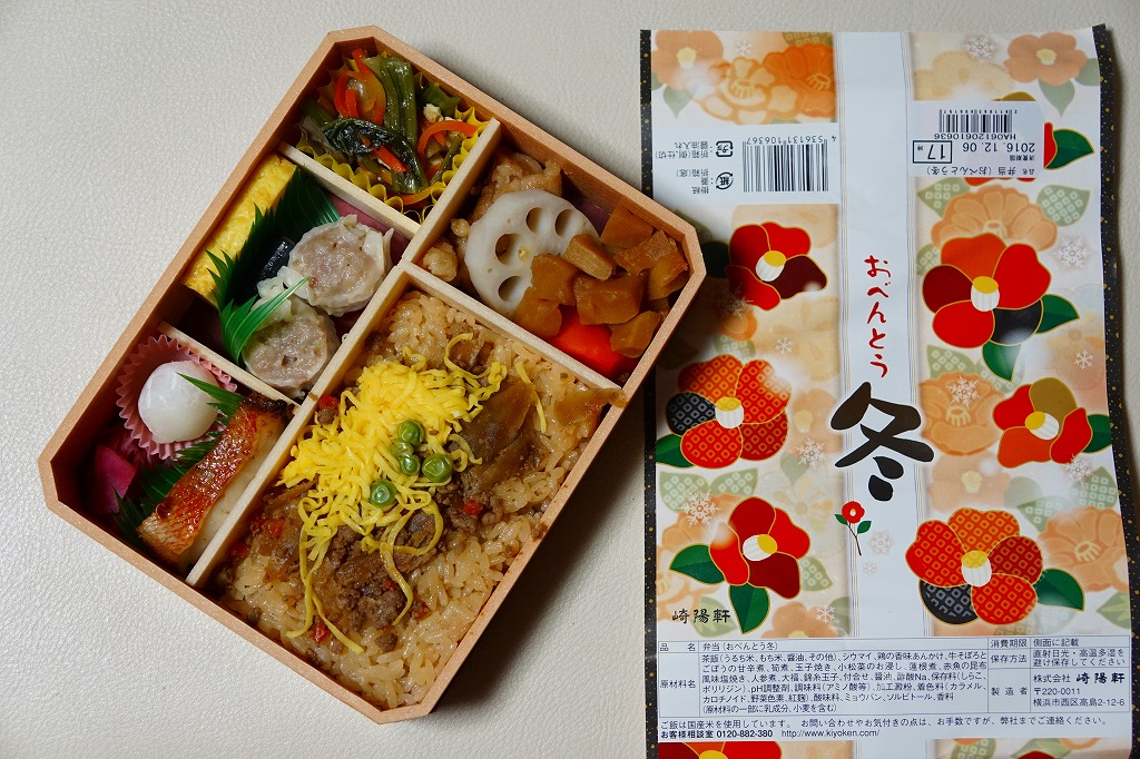 2003(平成15)年12月に初めて販売した、横浜駅の冬駅弁「おべんとう冬」の2016(平成28)年版で、12月1日から1月31日までの販売。掛紙と容器は前年と同じ。中身には変化があり、牛そぼろとごぼうの甘辛煮の茶飯に、赤魚の昆布風味塩焼き、鶏肉の香味あんかけ、レンコンとニンジンの煮物、小松菜のおひたし、タケノコ煮、玉子焼、しば大根漬け、小粒大福、シウマイ2個。茶飯がもちもちして、油っこくて、甘辛い味付けが強めに出ていて、今までの崎陽軒にないような味を持っていた。価格は20円のアップ。