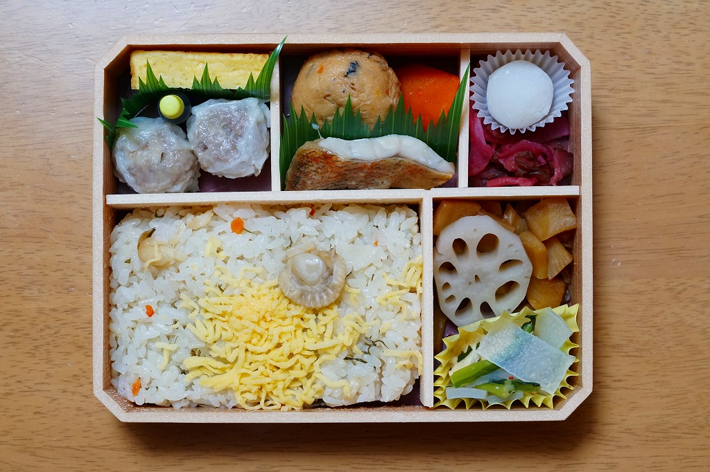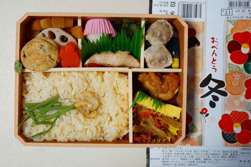 今回の中身は帆立御飯、赤魚照焼、鶏生姜煮、梅型こんにゃく煮、小松菜入りがんもどき煮、蓮根煮、根菜ごま和え、タケノコ煮、玉子焼、野沢菜ときゅうりの漬物、小粒大福、昔ながらのシウマイ2個。「冬」は中身もリニューアルされた感じ。