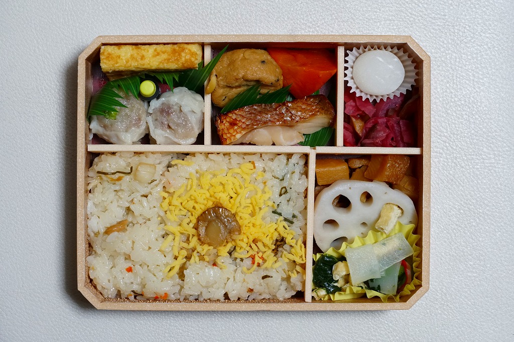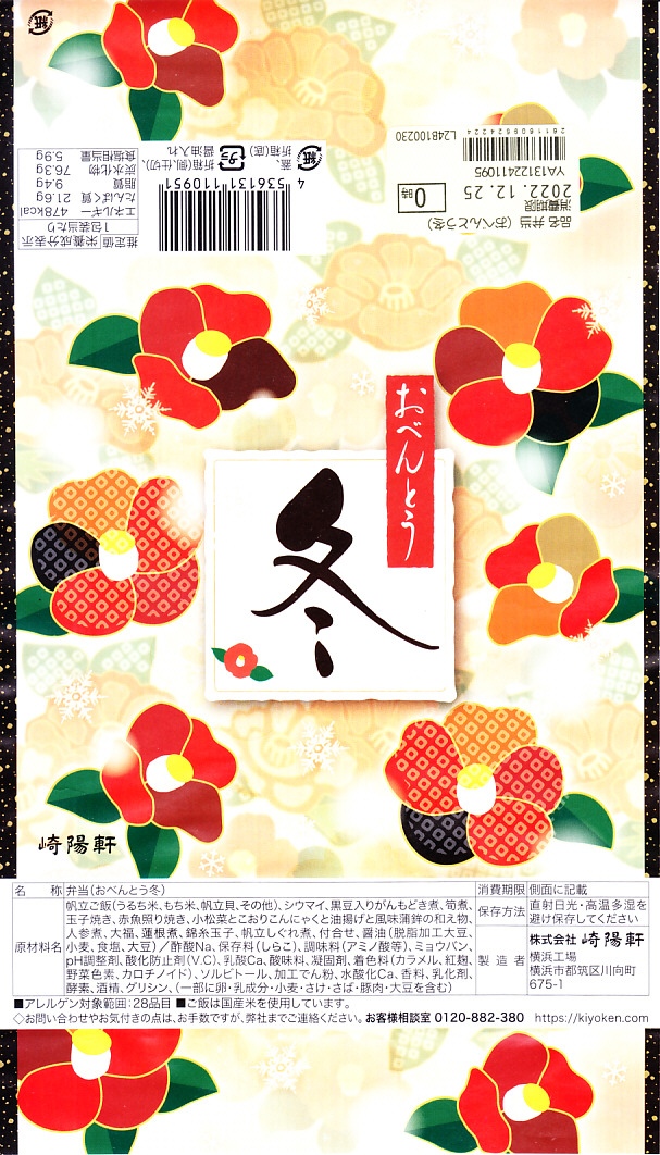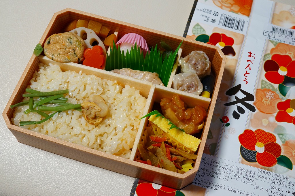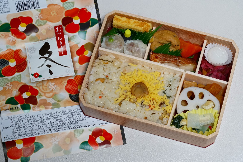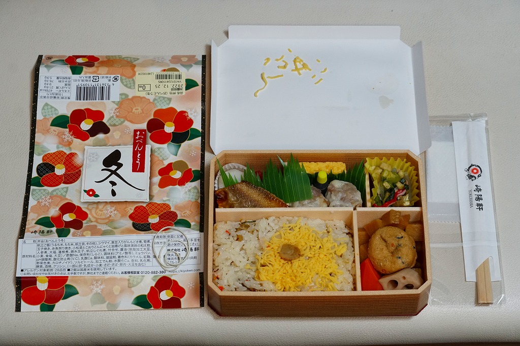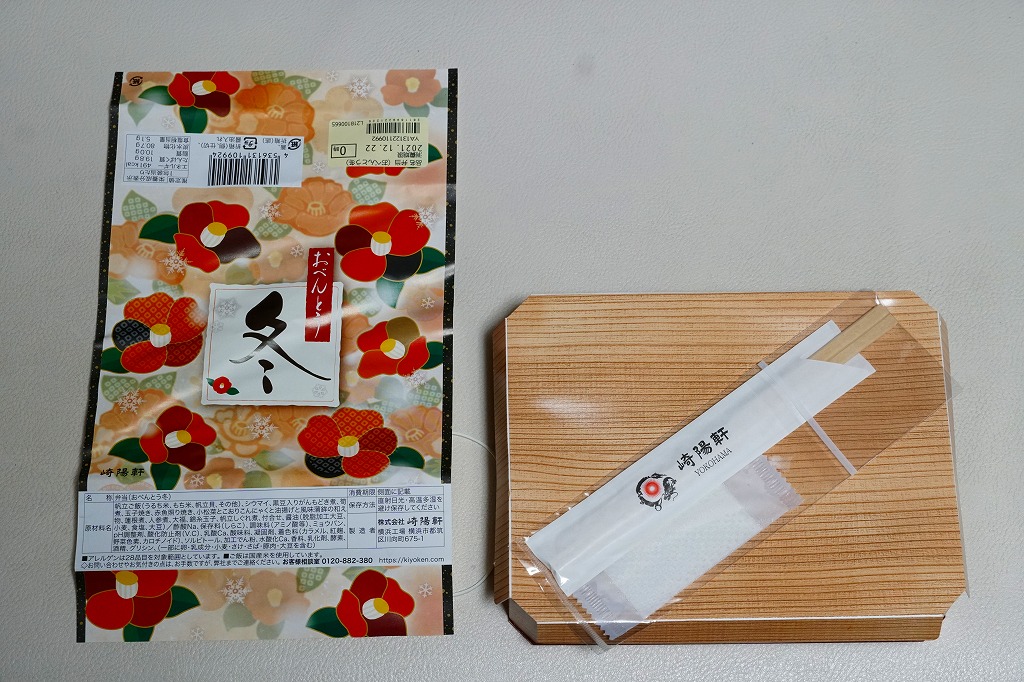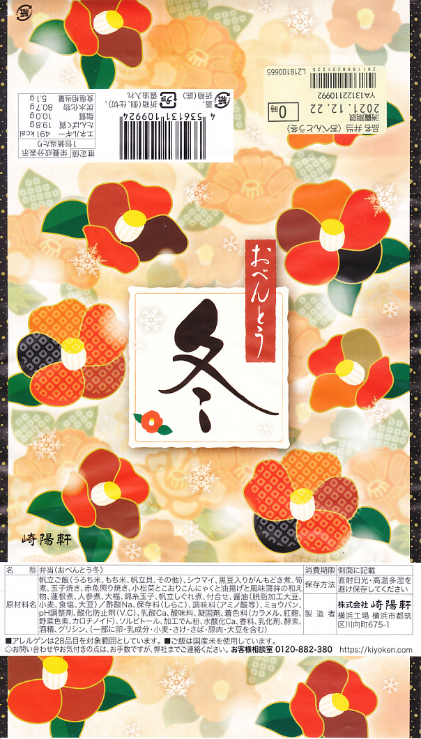 2003(平成15)年12月に初めて販売した、横浜駅の冬駅弁「おべんとう冬」の2022(令和4)年度版で、12月1日から1月31日までの販売。掛紙のツバキの絵柄も容器も内容も、3年連続で据え置かれた。中身は帆立御飯、赤魚の照焼、黒豆入りがんもどき煮、こおりこんにゃくと小松菜とカニ風味蒲鉾と油揚げの和え物、レンコンとニンジンの煮物、タケノコ煮、玉子焼、しば大根漬け、小粒大福、シウマイ2個。価格は30円のアップ。