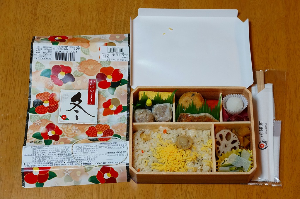 2003(平成15)年12月に初めて販売した、横浜駅の冬駅弁「おべんとう冬」の2020(令和2)年度版で、12月1日から1月31日までの販売。掛紙や容器と値段は、前年と同じ。今回の中身は、帆立御飯、赤魚の照焼、黒豆入りがんもどき煮、こおりこんにゃくと小松菜とカニ風味蒲鉾と油揚げの和え物、レンコンとニンジンの煮物、タケノコ煮、玉子焼、しば大根漬け、小粒大福、シウマイ2個。御飯が5年ぶりにホタテに戻り、風味が穏やかになった。