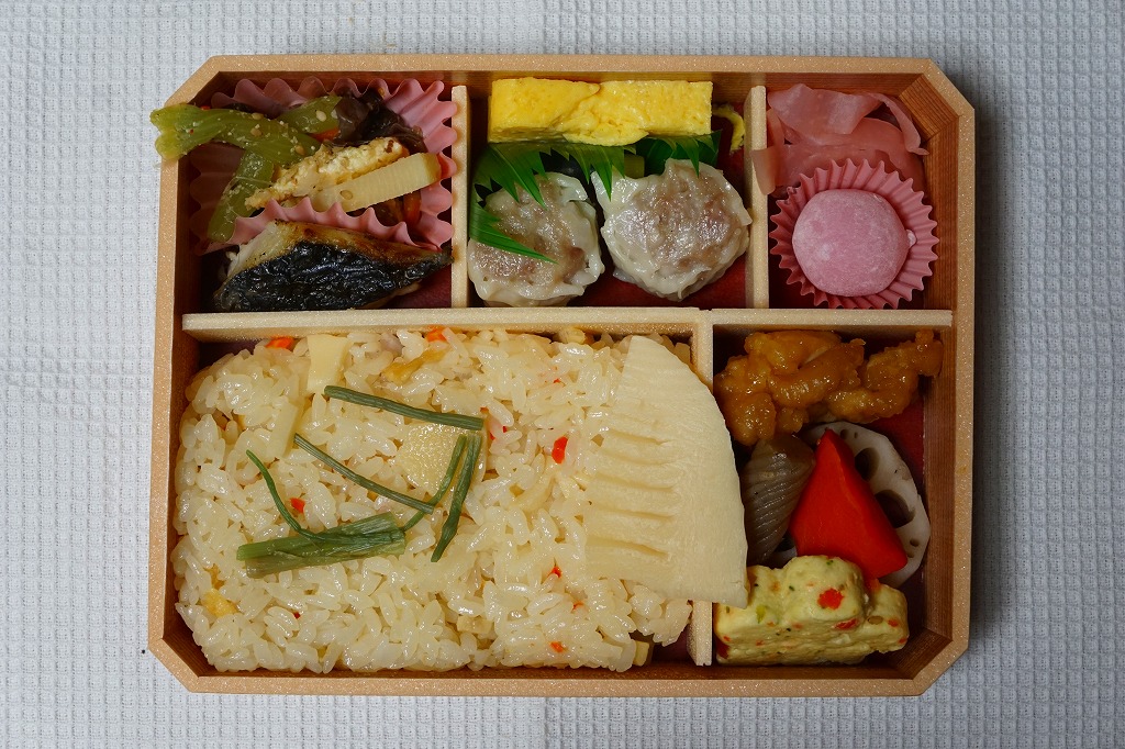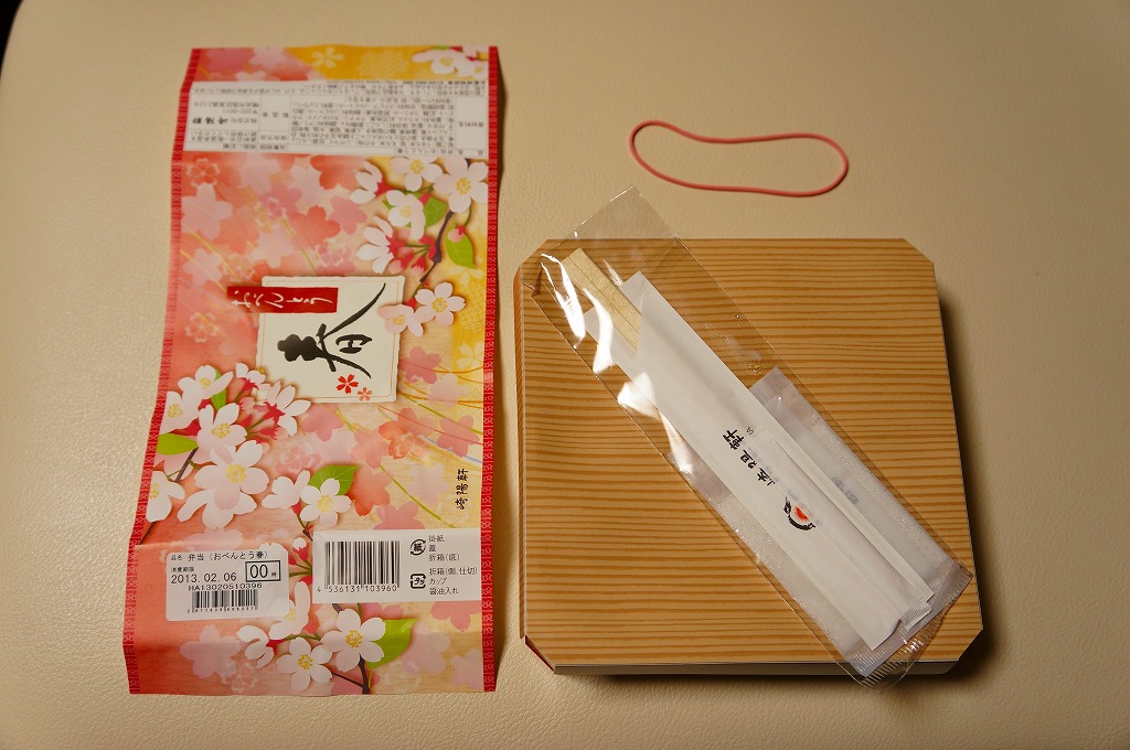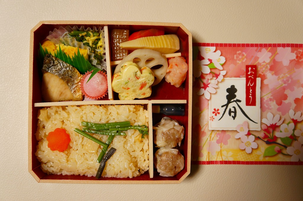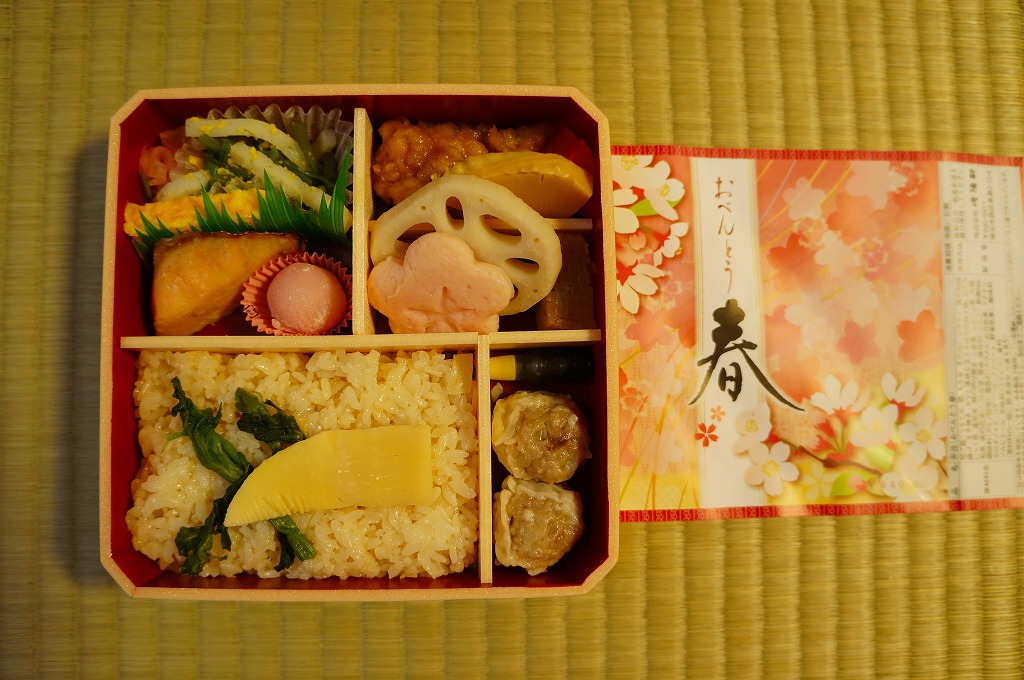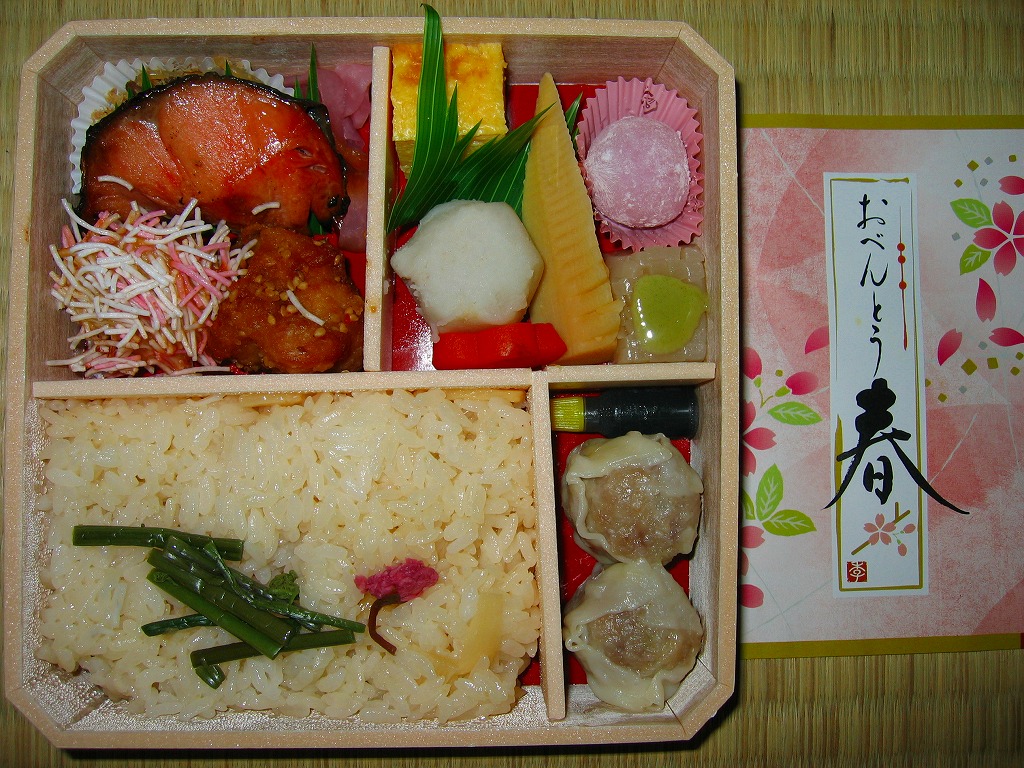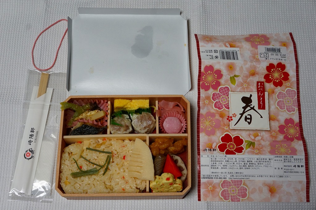 1998(平成10)年に発売された、小柄で安価な横浜駅の春駅弁。これは2012(平成24)年版で、2月から4月までの販売。今回の内容はタケノコ御飯にマス照焼、鶏利休揚、花形しんじょ、タケノコやニンジンなどの煮物、せりと蒲鉾と玉子そぼろの和え物、シウマイ2個、玉子焼、大根桜漬、桜あんの小粒大福。いつもの良いものを出してきている。淡い黄色や赤色が随所に表現される点も春らしい。