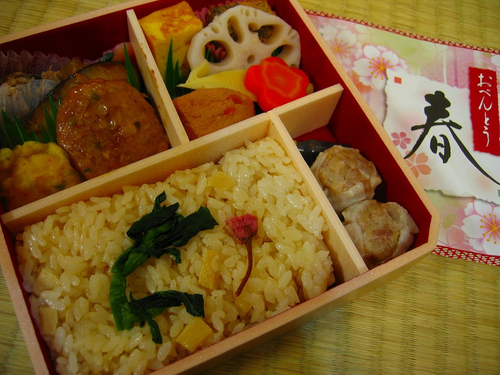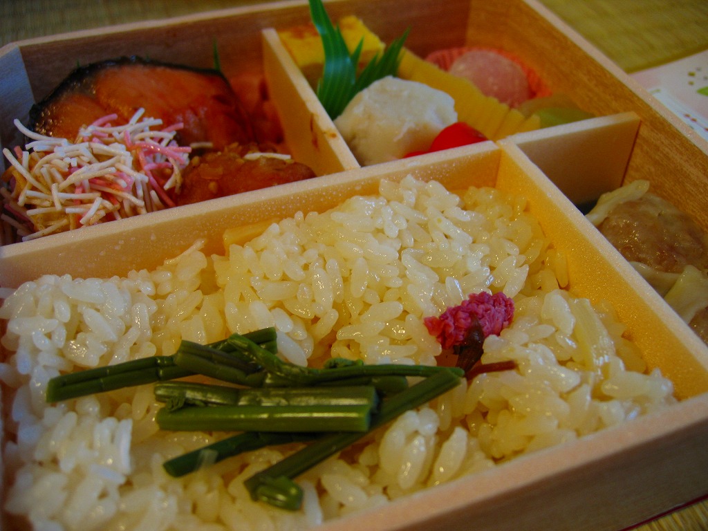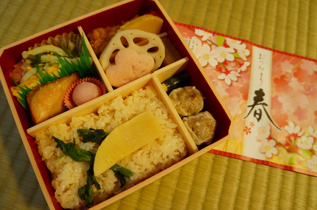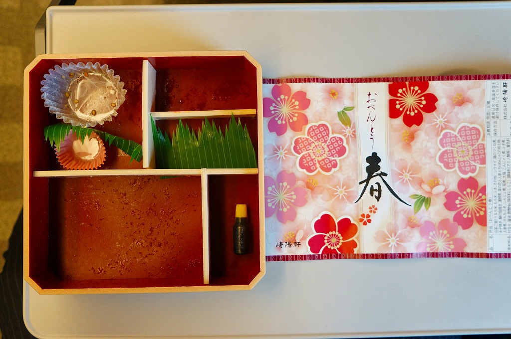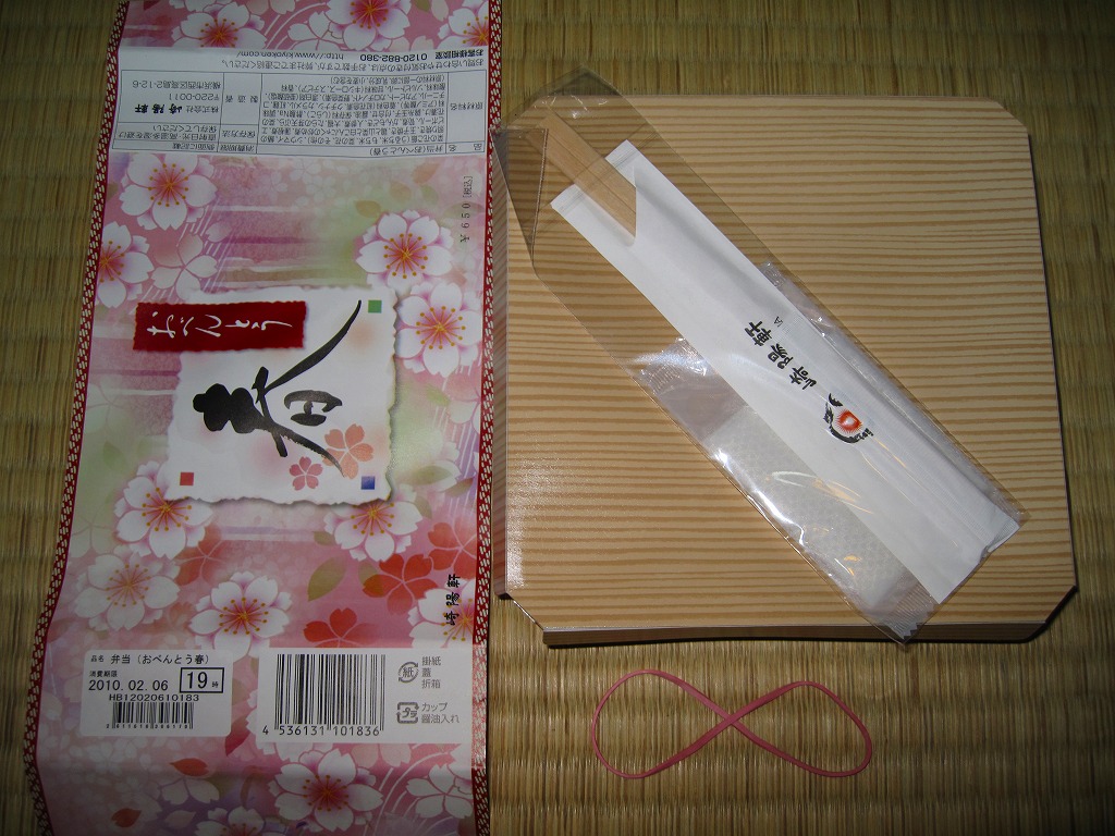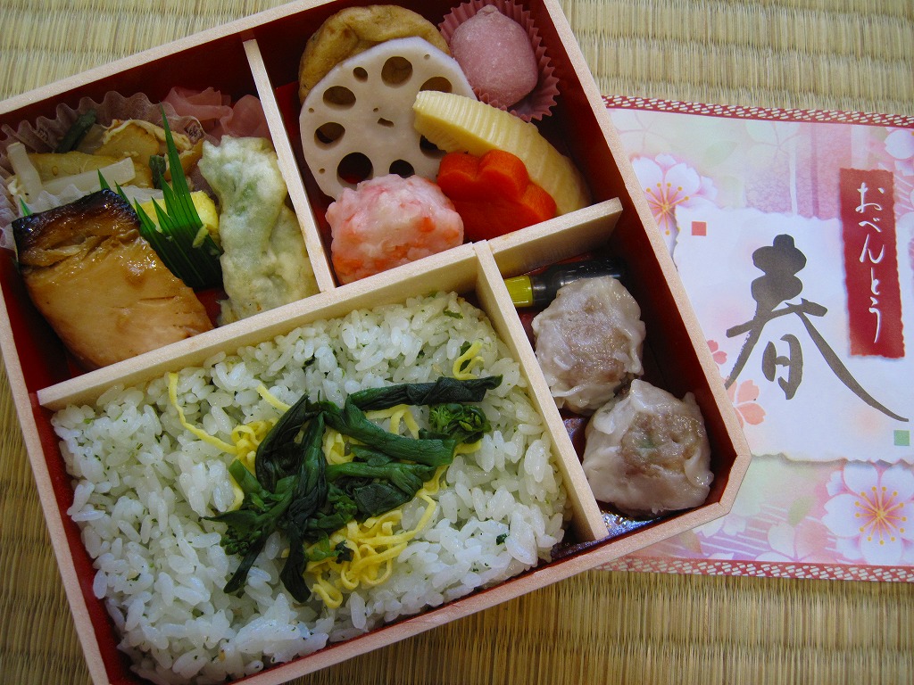1998(平成10)年に発売された、小柄で安価な横浜駅の春駅弁。これは2012(平成24)年版で、2月から4月までの販売。今回の内容はタケノコ御飯にマス照焼、鶏利休揚、花形しんじょ、タケノコやニンジンなどの煮物、せりと蒲鉾と玉子そぼろの和え物、シウマイ2個、玉子焼、大根桜漬、桜あんの小粒大福。いつもの良いものを出してきている。淡い黄色や赤色が随所に表現される点も春らしい。