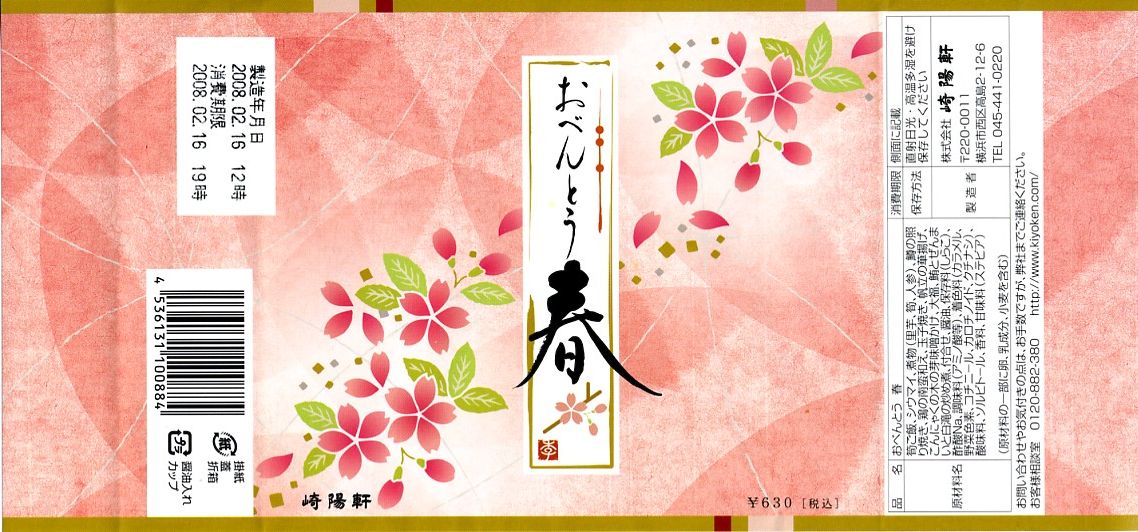 1998(平成10)年に発売された、小柄で安価な横浜駅の春駅弁。これは2008(平成20)年版で、2月から5月までの販売。2007年版を買い損ねたが、2006年版と比べても、御飯の上や煮物のあたりに少々の誤差がある程度で、こちらも内容は固まった模様。ただし価格は40円アップの630円。格安感はなくなったが、まだ割安感はある。