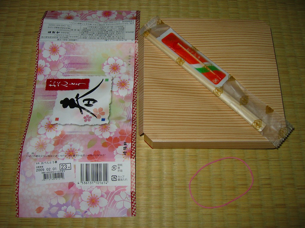 1998(平成10)年に発売された、小柄で安価な横浜駅の春駅弁。これは2009(平成21)年版で、2月から5月までの販売。桜と菜の花を載せたタケノコ御飯に、サワラ照焼、つくね、マグロと山菜等の炒め煮、がんもどきやタケノコなどの煮物、海老黄身南蛮揚、玉子焼、わらびもちが入る内容は、前年と雰囲気的にはほぼ同一。値上げが続いて価格を650円まで上げてきたが、絶対値では駅弁としてはまだまだ安いし、少量上品のコンセプトを変えないまま、ここ数年でおかずがおかずらしくなってきたと思う。