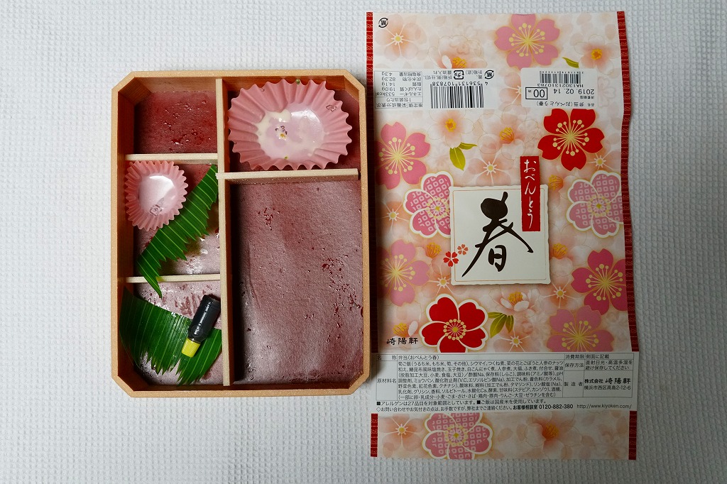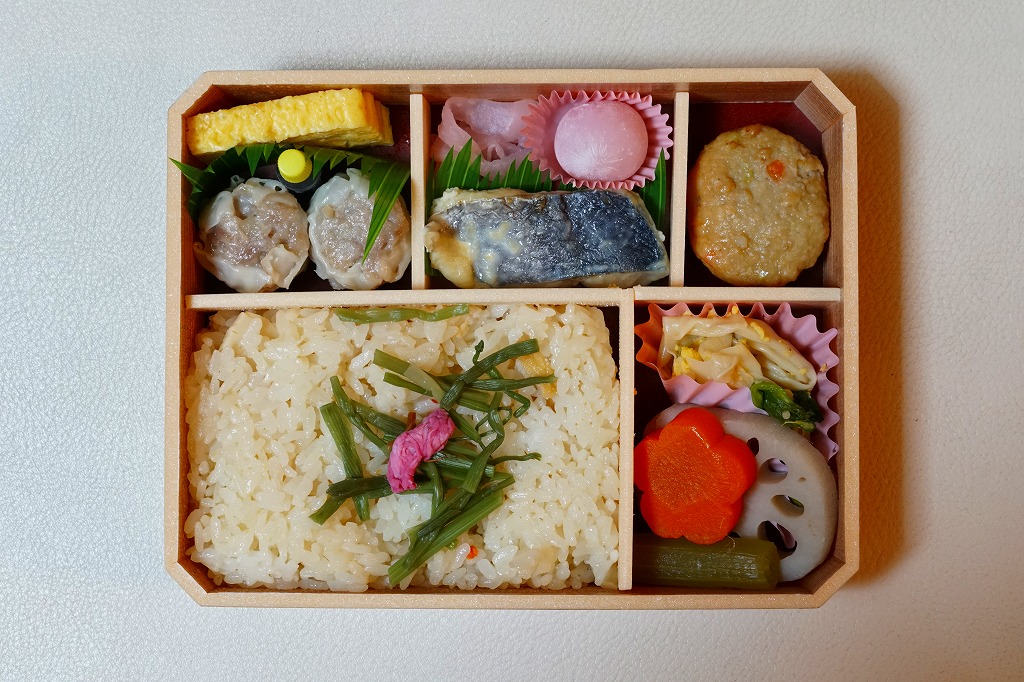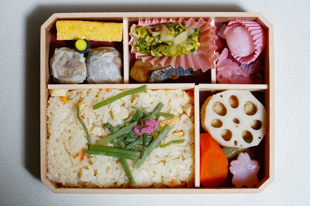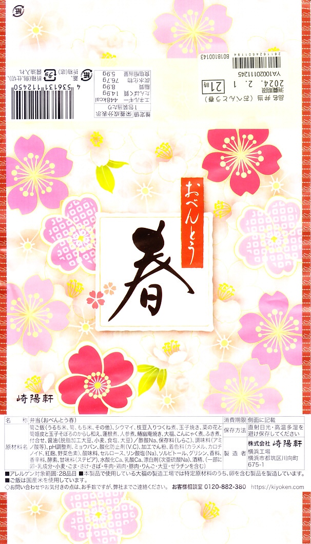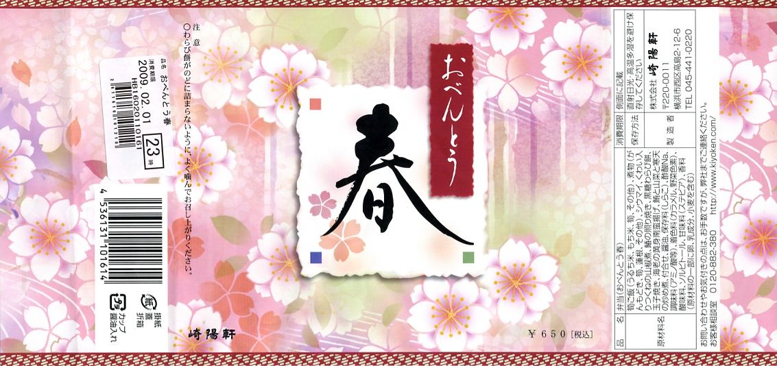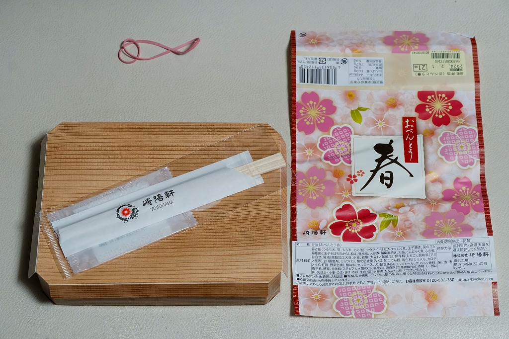 1998(平成10)年に発売された、小柄で安価な横浜駅の春駅弁。これは2024(令和6)年版で、2月1日から4月15日までの販売。春色と桜花でできている掛紙は、絵柄は2014(平成26)年から、形状は2017(平成29)年から変わらない。中身も前年と同じで、タケノコ御飯、サワラの幽庵焼き、彩りつくねの旨煮、ニンジンやフキやレンコンなどの煮物、菜の花やタケノコなどの辛子和え物、玉子焼、桜大根、桜ミニ大福、シウマイ2個。価格は60円アップ。