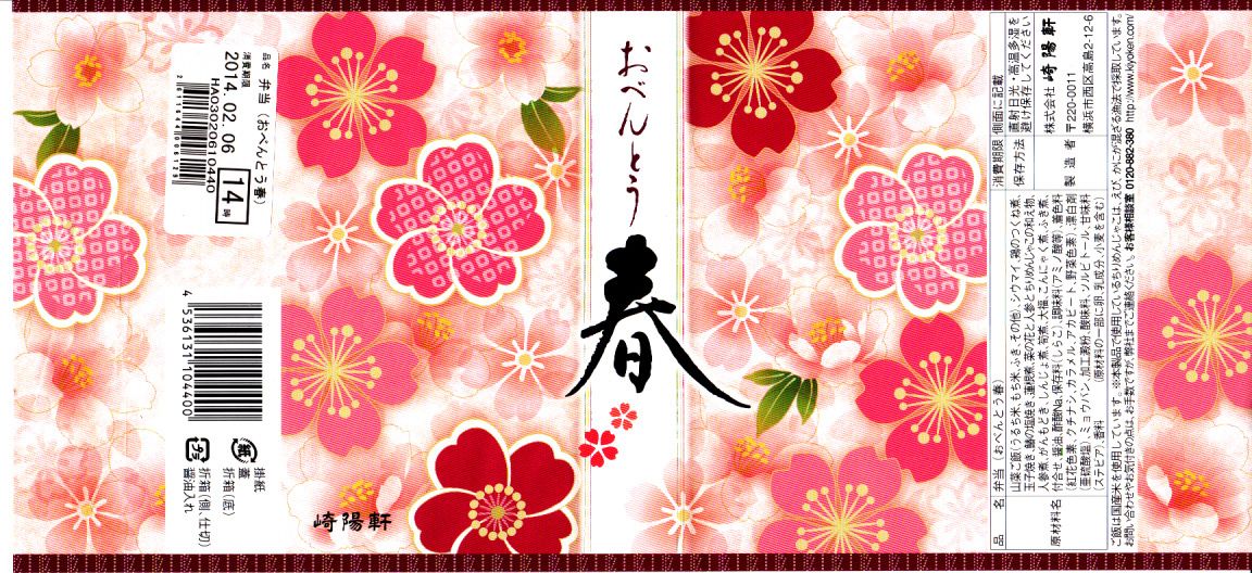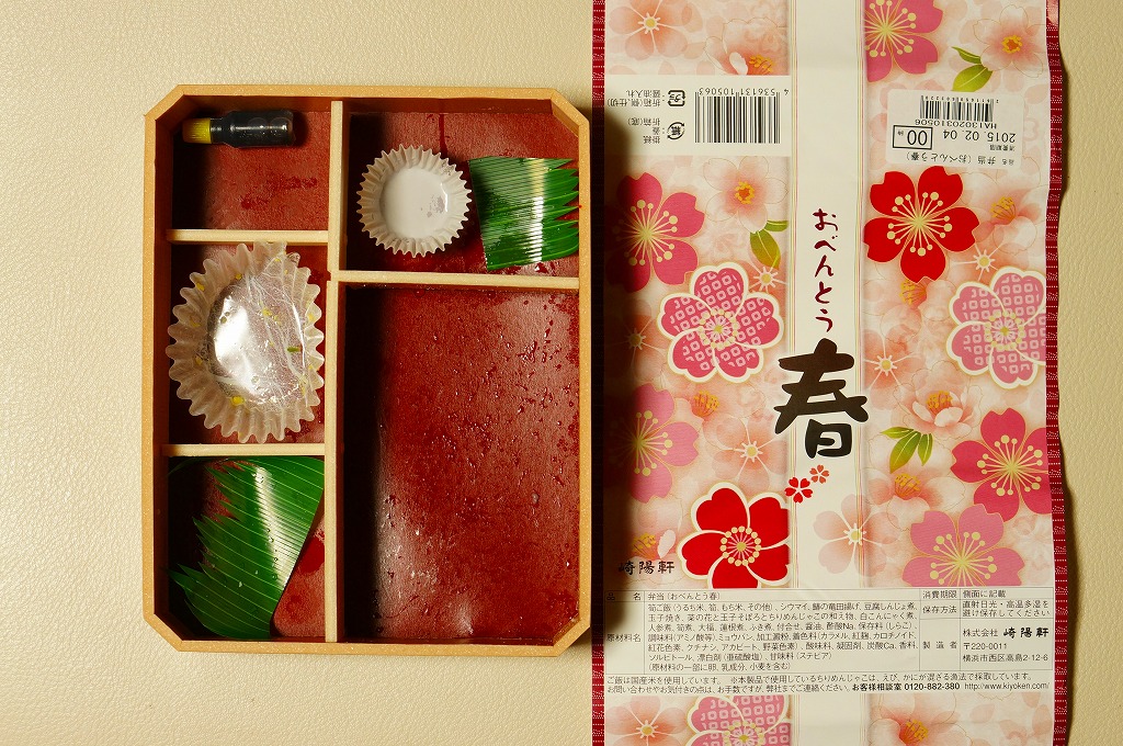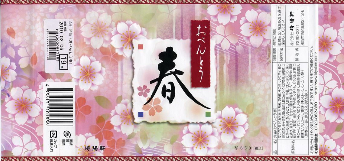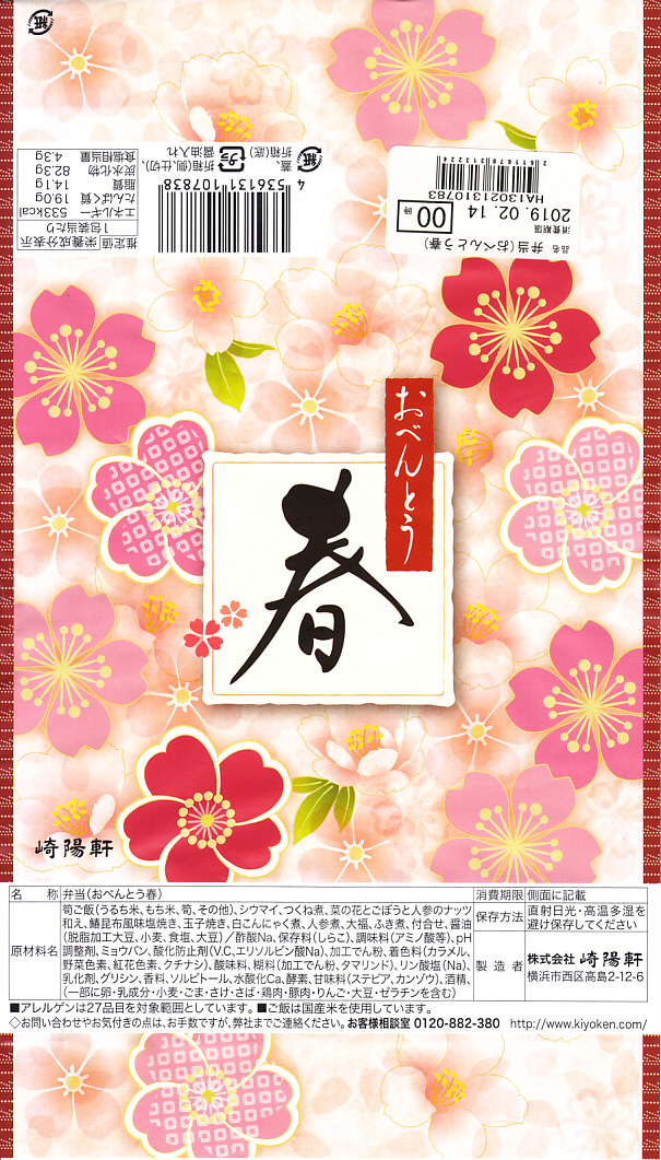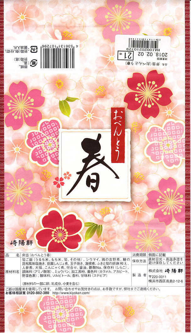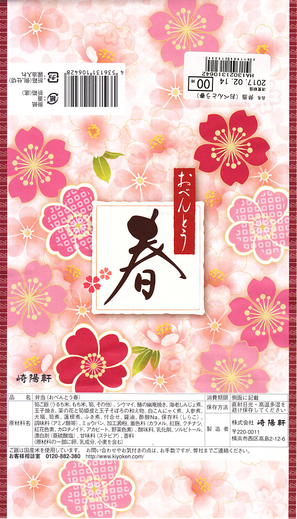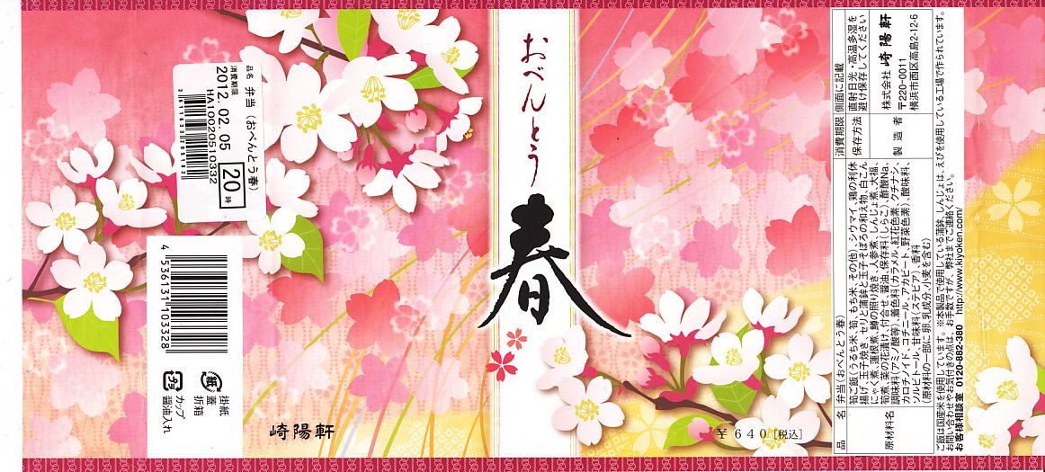 1998(平成10)年に発売された、小柄で安価な横浜駅の春駅弁。これは2015(平成27)年版で、2月1日から4月15日頃までの販売。前年秋の「おべんとう秋」からのものと同じく、容器が横に、掛紙が縦に長くなった。今回の内容はタケノコ御飯、サワラ竜田揚、ニンジンやレンコンなどの煮物、菜の花と玉子そぼろとちりめんじゃこの和え物、玉子焼、桜大根、桜ミニ大福、シウマイ2個。彩りや詰め方の違いもあり、なんとなく内容がスッキリしたように思えた。消費税率アップの影響か、価格は30円の値上げ。