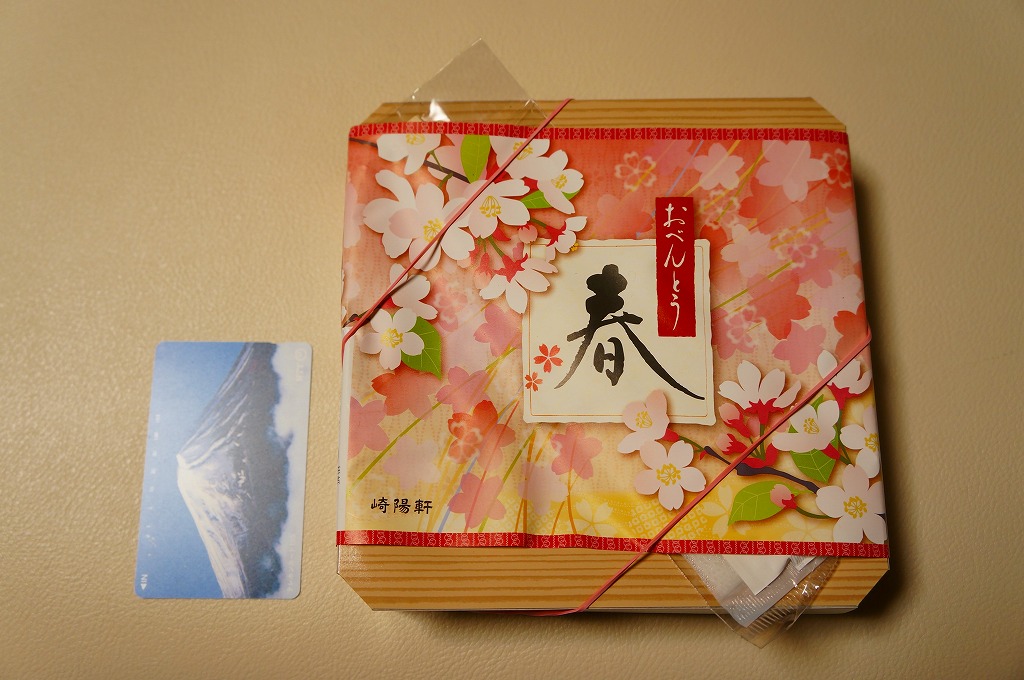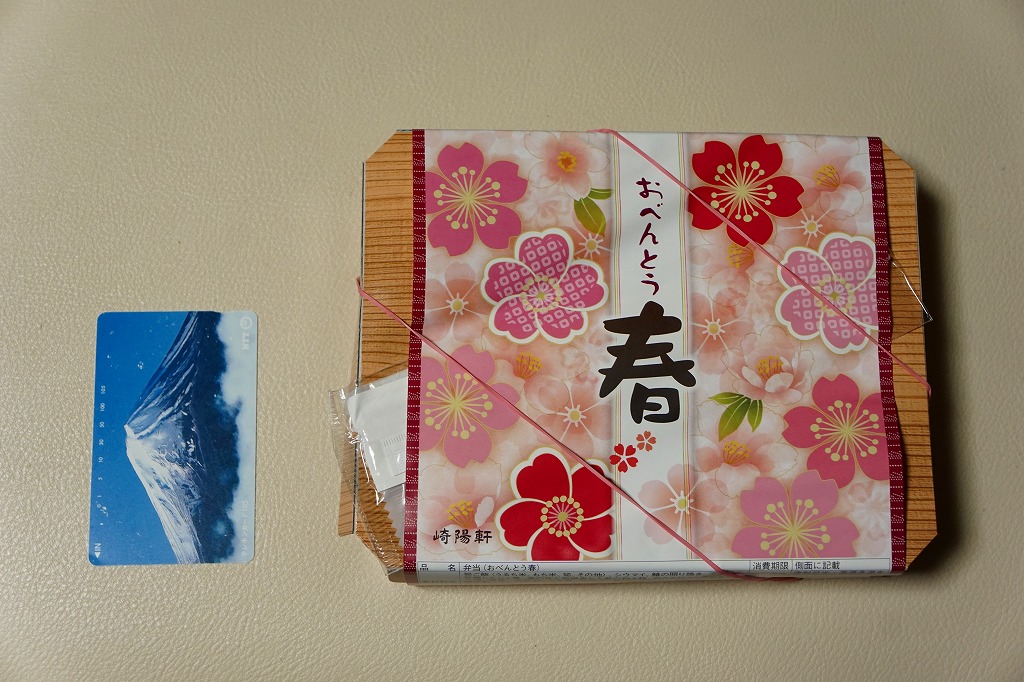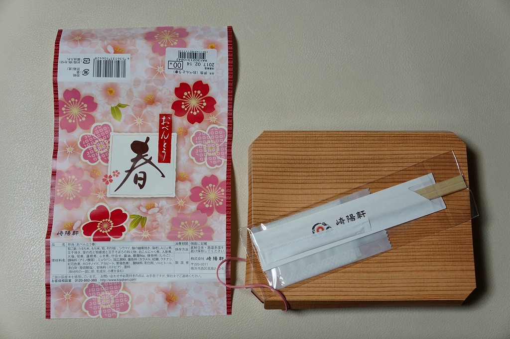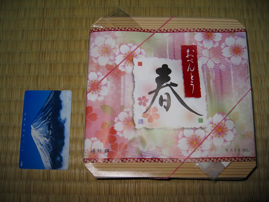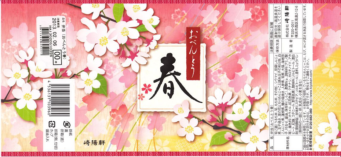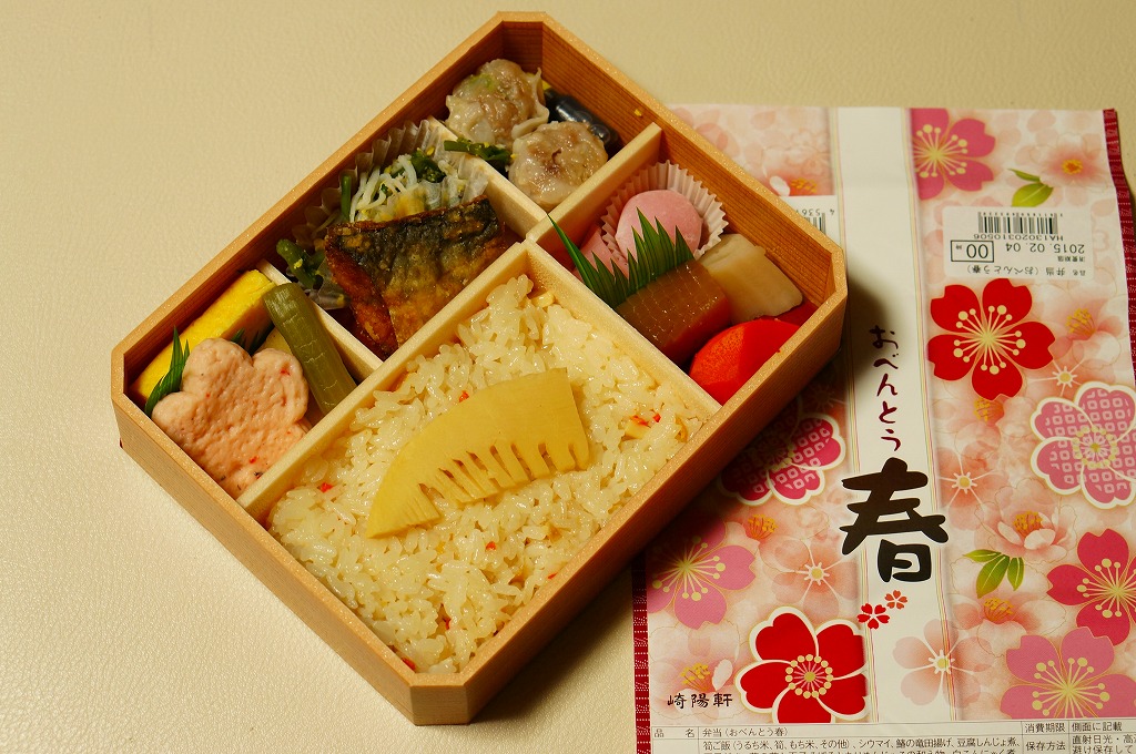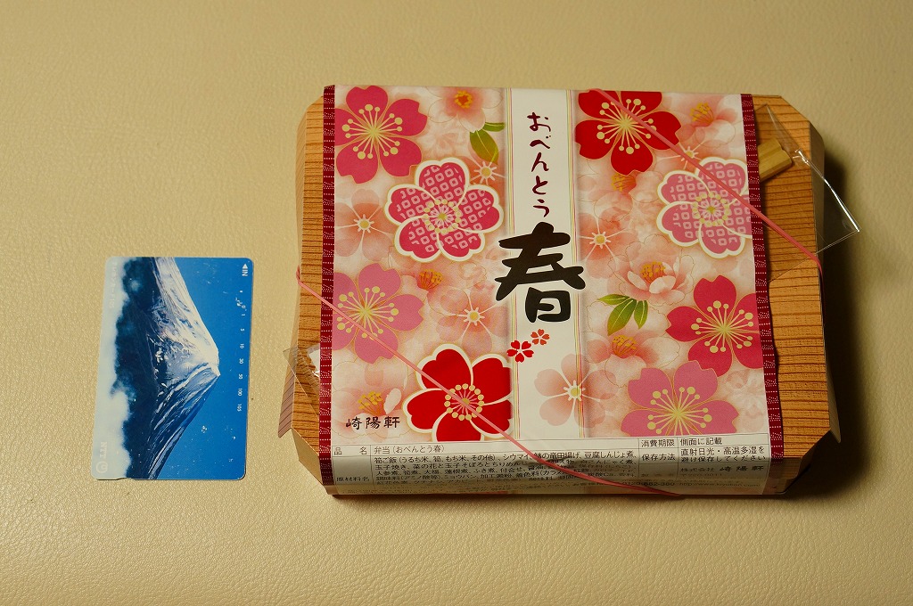 1998(平成10)年に発売された、小柄で安価な横浜駅の春駅弁。これは2015(平成27)年版で、2月1日から4月15日頃までの販売。前年秋の「おべんとう秋」からのものと同じく、容器が横に、掛紙が縦に長くなった。今回の内容はタケノコ御飯、サワラ竜田揚、ニンジンやレンコンなどの煮物、菜の花と玉子そぼろとちりめんじゃこの和え物、玉子焼、桜大根、桜ミニ大福、シウマイ2個。彩りや詰め方の違いもあり、なんとなく内容がスッキリしたように思えた。消費税率アップの影響か、価格は30円の値上げ。