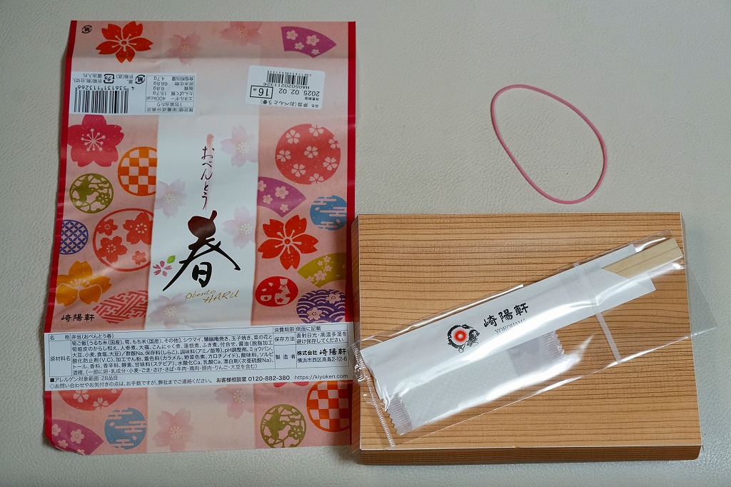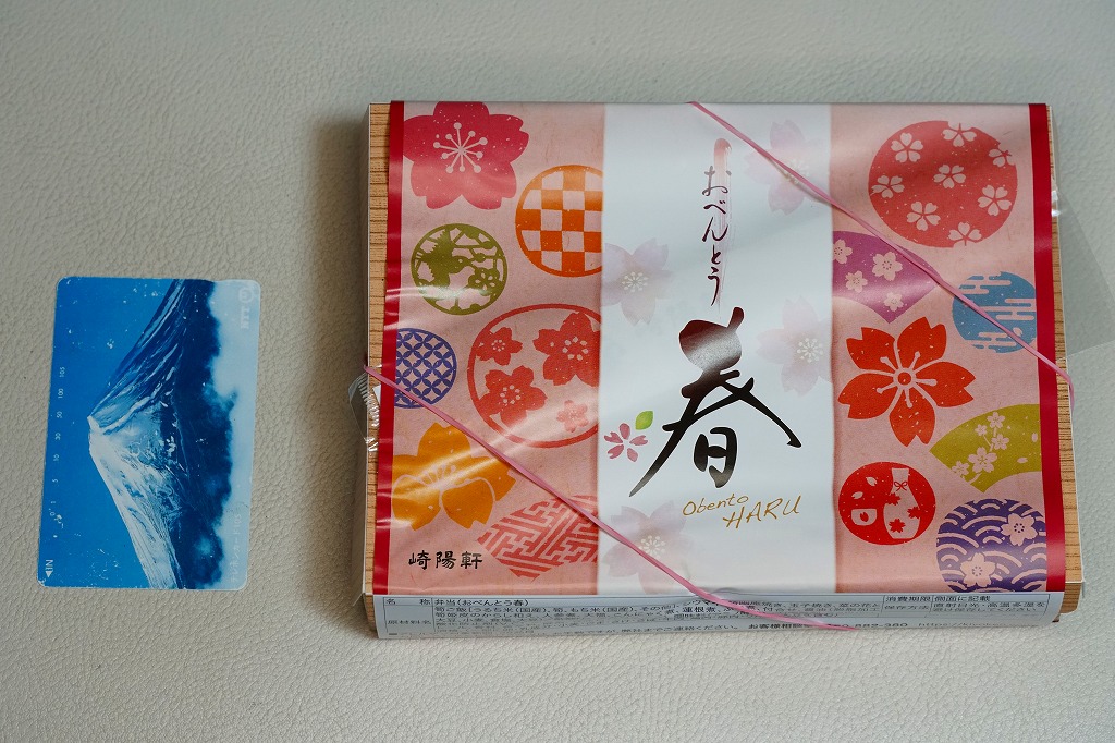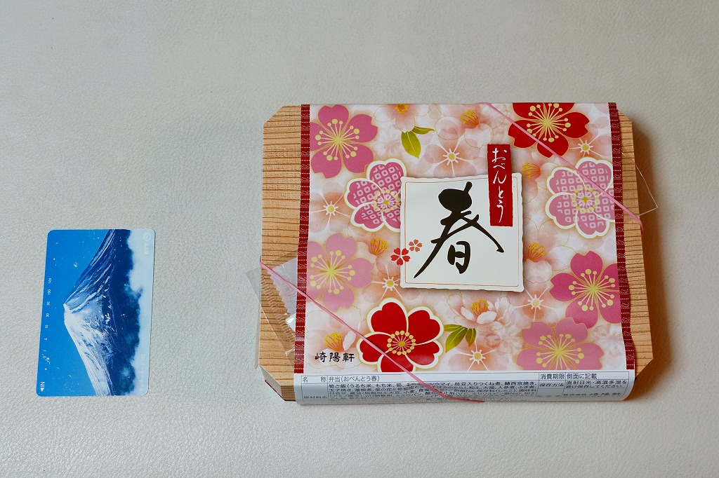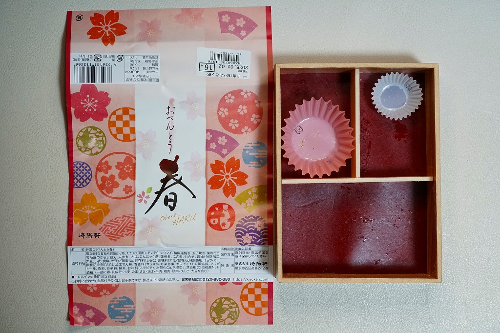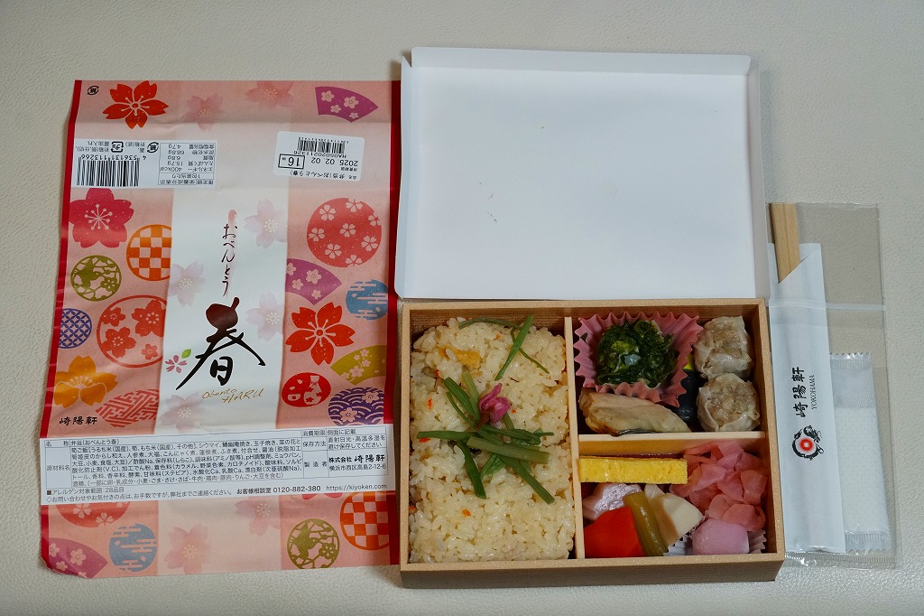 1998(平成10)年に発売された、小柄で安価な横浜駅の春駅弁。これは2025(令和7)年版で、2月1日から4月15日までの販売。掛紙の絵柄は11年ぶりに変わり、桜花デザインの様々な紋章で覆う。容器はかつて並等の幕の内駅弁で使われたような、小柄で四角いものに変更。今回の中身はタケノコ御飯、サワラの幽庵焼き、ニンジンやフキやレンコンなどの煮物、菜の花とタケノコの辛子和え物、玉子焼、桜大根、桜ミニ大福、シウマイ2個で、おかずが1品減った気がする。価格は20円のアップ。