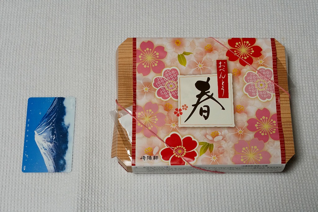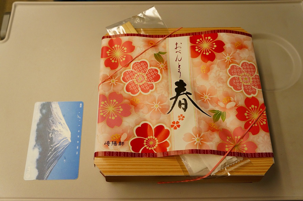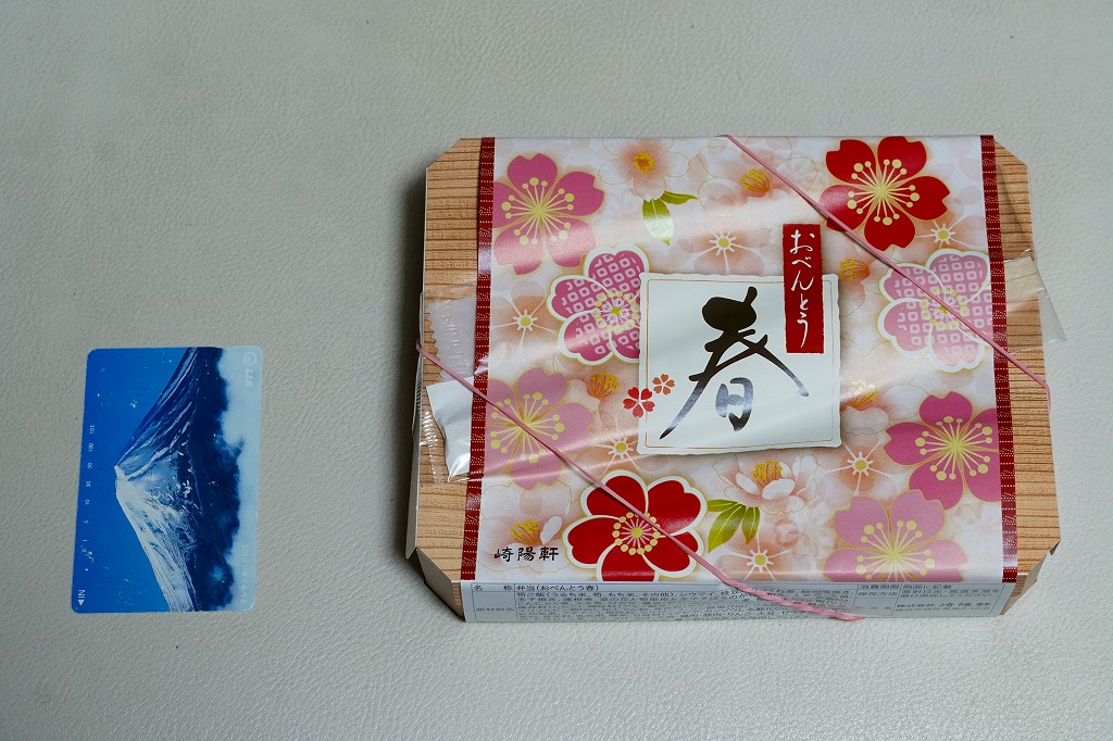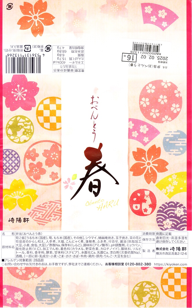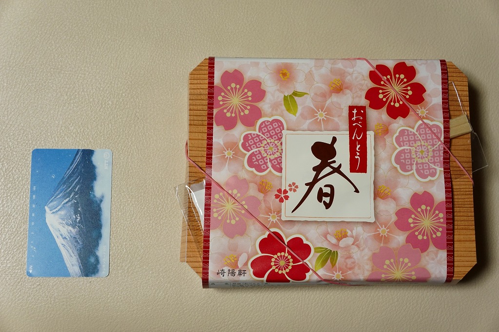 1998(平成10)年に発売された、小柄で安価な横浜駅の春駅弁。これは2025(令和7)年版で、2月1日から4月15日までの販売。掛紙の絵柄は11年ぶりに変わり、桜花デザインの様々な紋章で覆う。容器はかつて並等の幕の内駅弁で使われたような、小柄で四角いものに変更。今回の中身はタケノコ御飯、サワラの幽庵焼き、ニンジンやフキやレンコンなどの煮物、菜の花とタケノコの辛子和え物、玉子焼、桜大根、桜ミニ大福、シウマイ2個で、おかずが1品減った気がする。価格は20円のアップ。