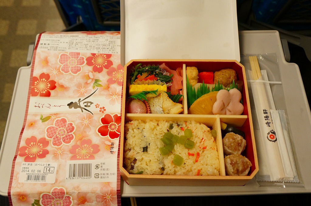 1998(平成10)年に発売された、小柄で安価な横浜駅の春駅弁。これは2014(平成26)年版で、2月1日から4月15日頃までの販売。今回の内容は山菜御飯、サワラ塩焼、タケノコやニンジンやレンコンなどの煮物、菜の花とニンジンとちりめんじゃこの和え物、玉子焼、桜大根、桜ミニ大福、シウマイ2個。掛紙の絵柄も含めて、前年とちょっとだけ違う。