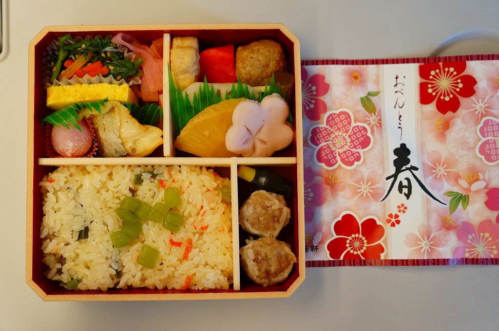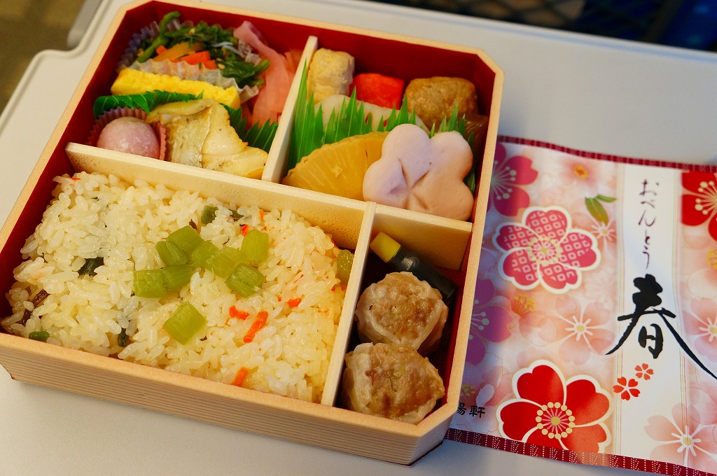 1998(平成10)年に発売された、小柄で安価な横浜駅の春駅弁。これは2010(平成22)年版で、2月から5月までの販売。今回の内容は菜の花御飯にサワラ照焼、タラの芽の天ぷら、エビボール、タケノコやレンコンなどの煮物、鶏肉と山菜などの炒め煮、シウマイ2個、桜大福。