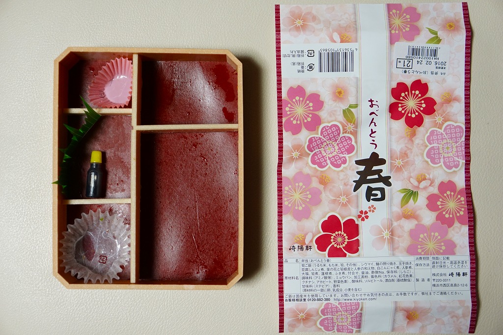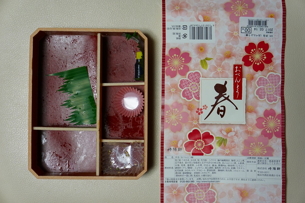 1998(平成10)年に発売された、小柄で安価な横浜駅の春駅弁。これは2016(平成28)年版で、2月1日から4月15日頃までの販売。今回の内容はタケノコ御飯、サワラ照焼、ニンジンやレンコンやタケノコなどの煮物、菜の花とタケノコとニンジンの和え物、玉子焼、桜大根、桜ミニ大福、シウマイ2個。写真で比べれば、おかずの配置がだいぶ変わったことに気が付くが、雰囲気としては引き続き、毎年同じ感じがする。