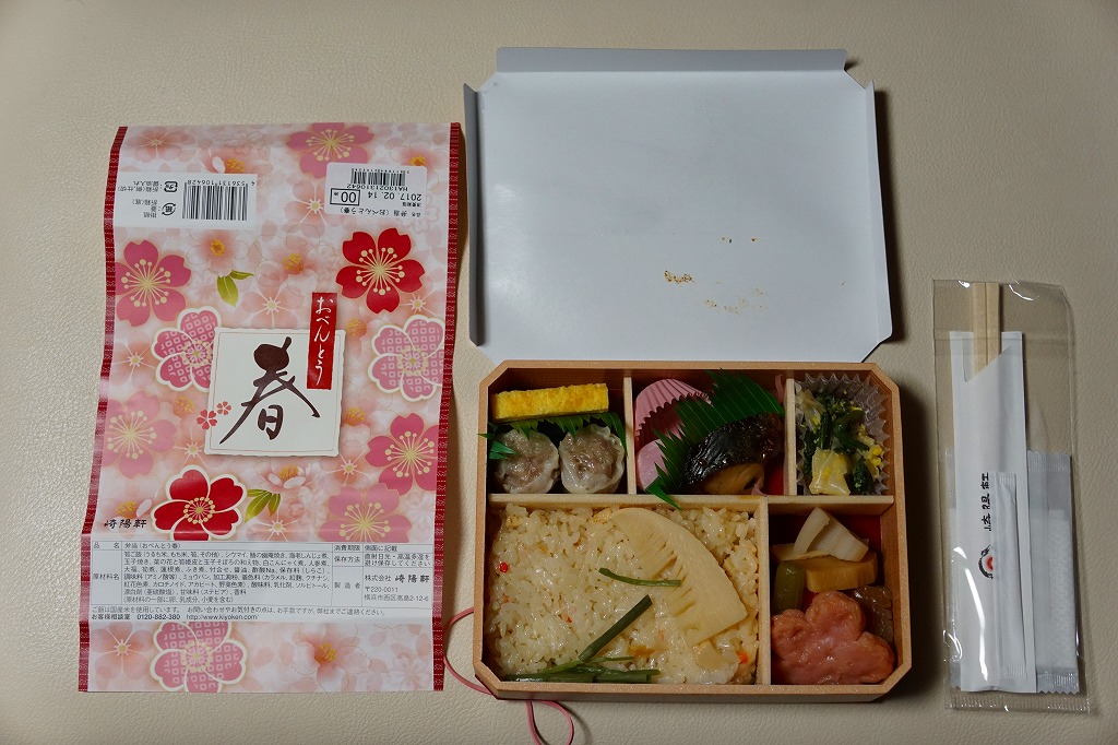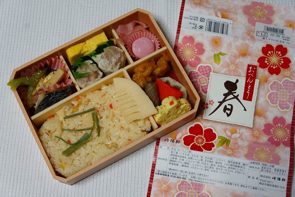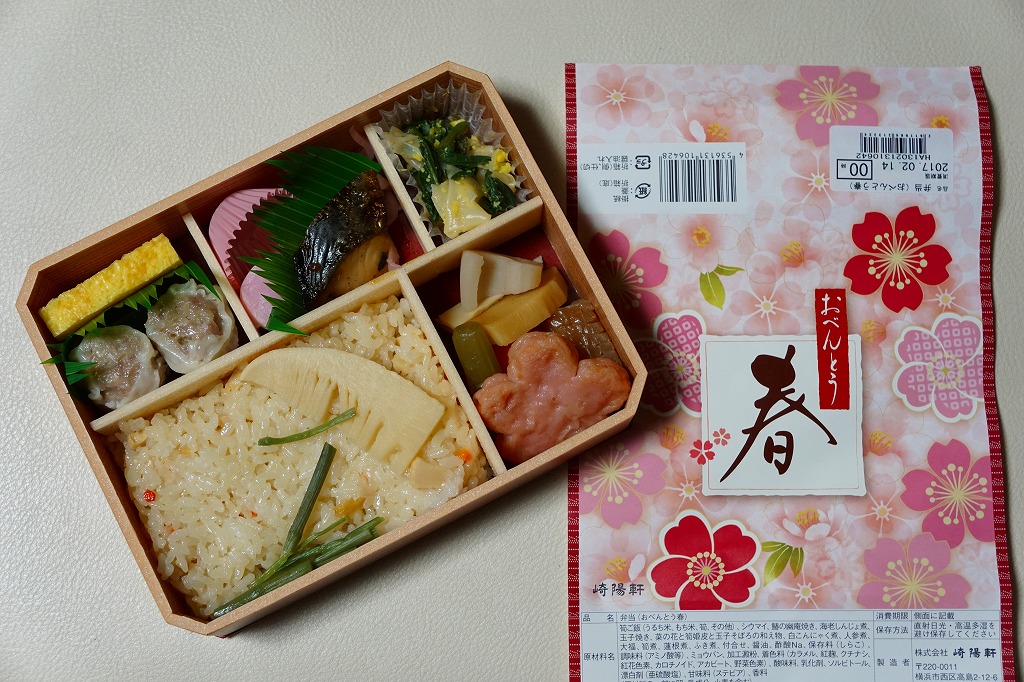 1998(平成10)年に発売された、小柄で安価な横浜駅の春駅弁。これは2017(平成29)年版で、2月1日から4月15日頃までの販売。今回の内容はタケノコ御飯、サワラ幽庵焼、ニンジンやレンコンやタケノコなどの煮物、菜の花とタケノコと玉子そぼろの和え物、玉子焼、桜大根、桜ミニ大福、シウマイ2個。掛紙の文字が固めになり、シウマイの位置が変わり、価格が20円上がったが、やはり雰囲気はほぼ変わらない。