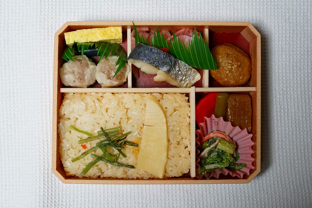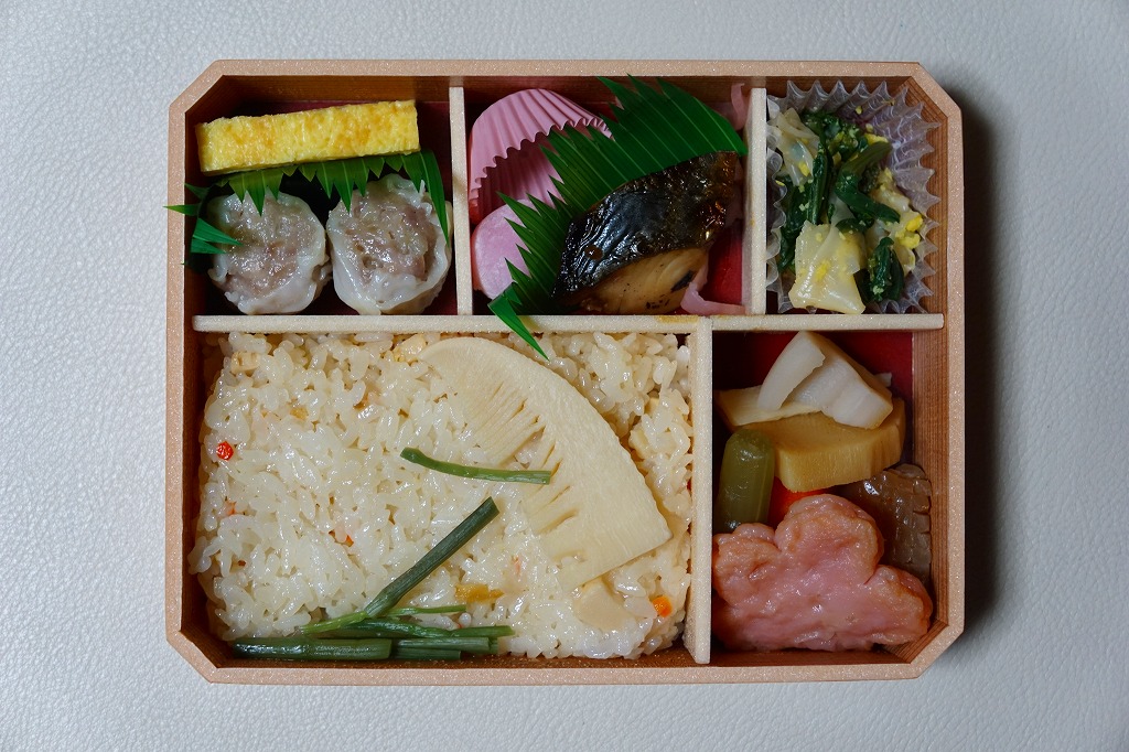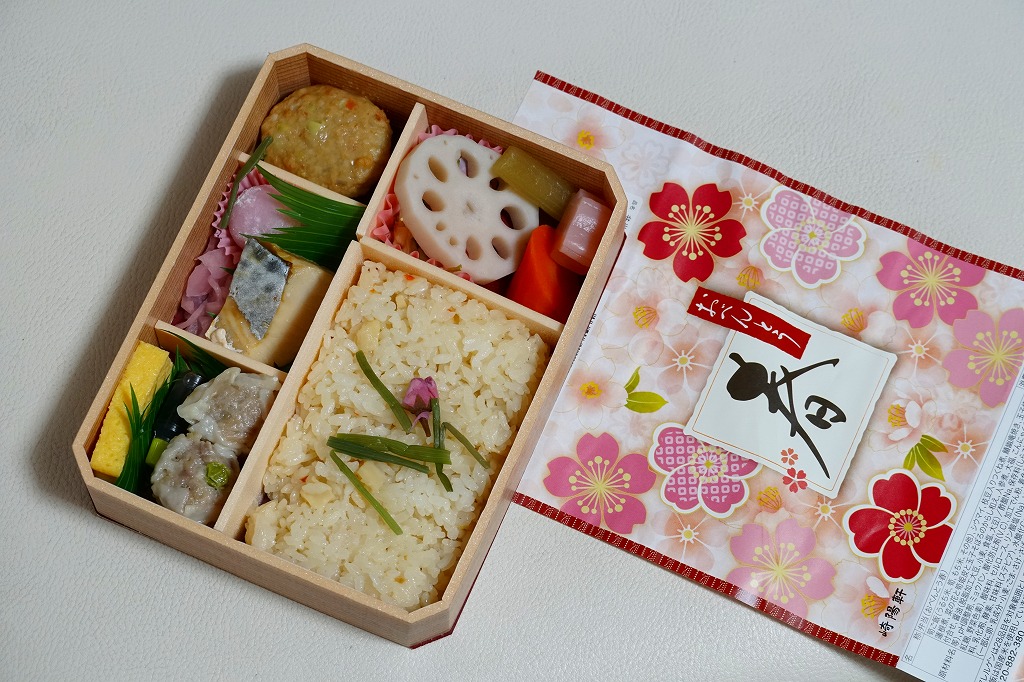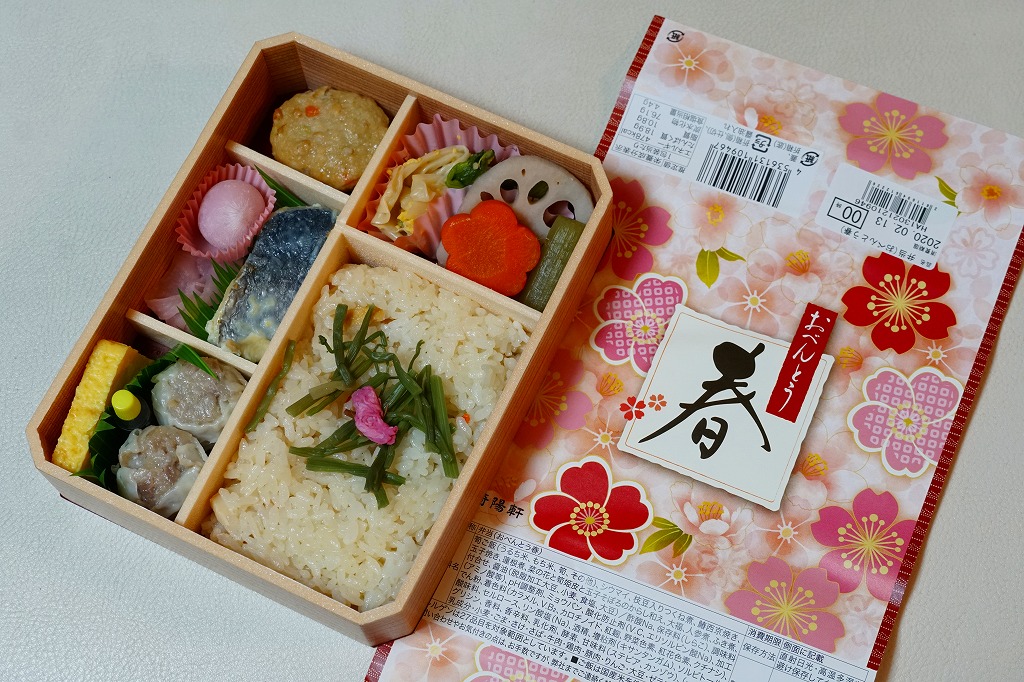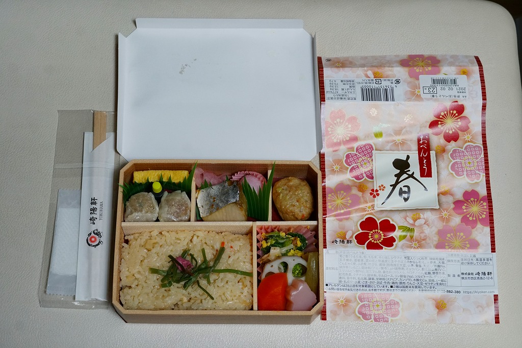 1998(平成10)年に発売された、小柄で安価な横浜駅の春駅弁。これは2020(令和2)年版で、2月1日から4月15日までの販売。今回の内容はタケノコ御飯、サワラの西京焼き、ニンジンやフキやレンコンなどの煮物、菜の花やタケノコなどの和え物、玉子焼、桜大根、桜ミニ大福、シウマイ2個。
