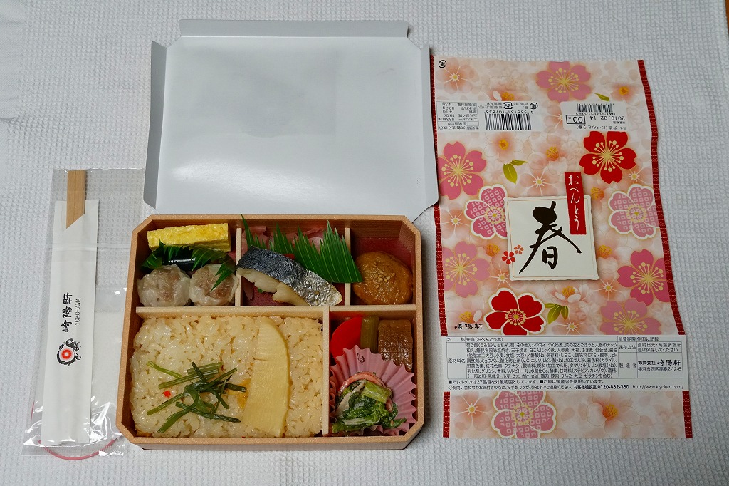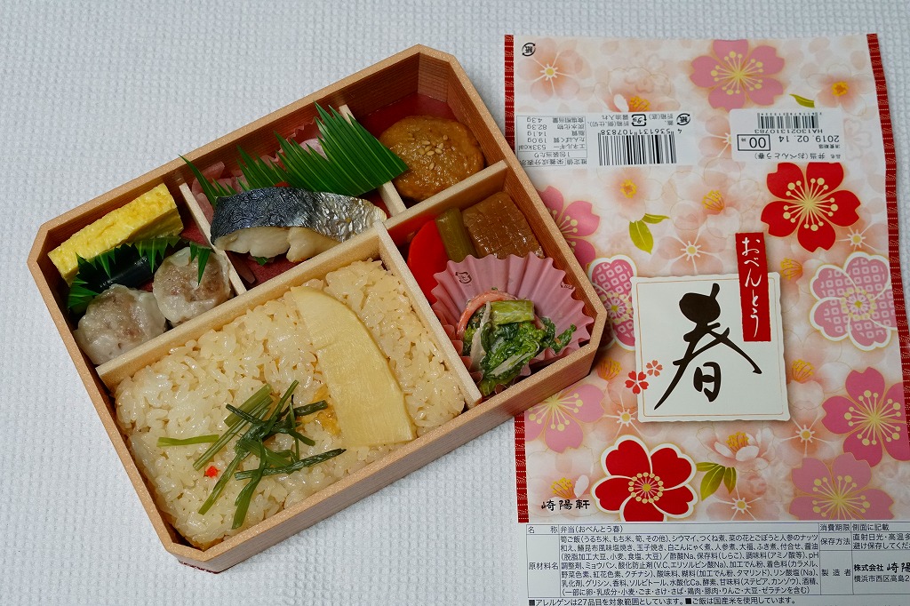 1998(平成10)年に発売された、小柄で安価な横浜駅の春駅弁。これは2019(平成31)年版で、2月1日から4月15日までの販売。今回の内容はタケノコ御飯、サワラの昆布風味塩焼、ニンジンやフキやコンニャクなどの煮物、菜の花やごぼうなどの和え物、玉子焼、桜大根、桜ミニ大福、シウマイ2個。値段が30円上がった。