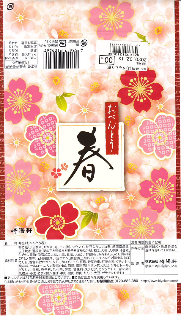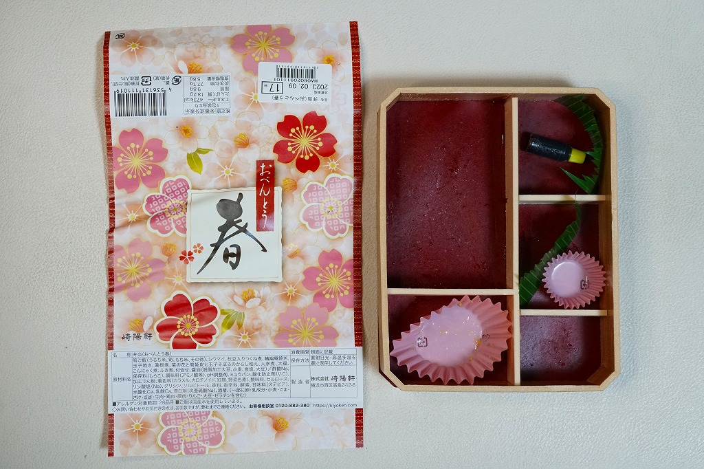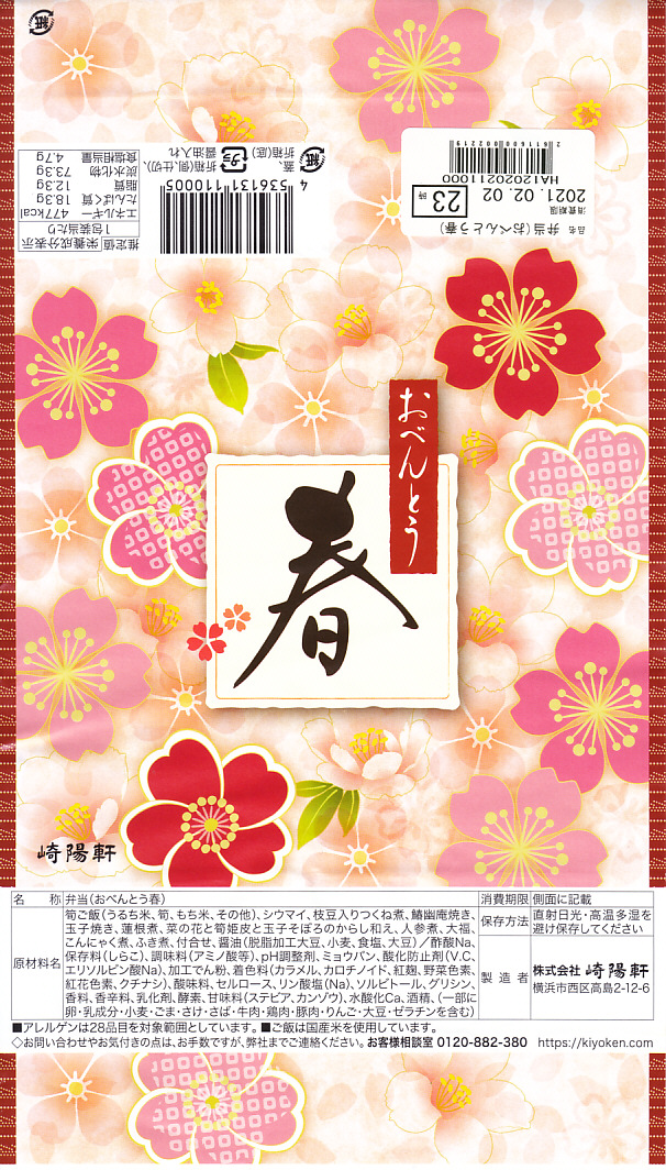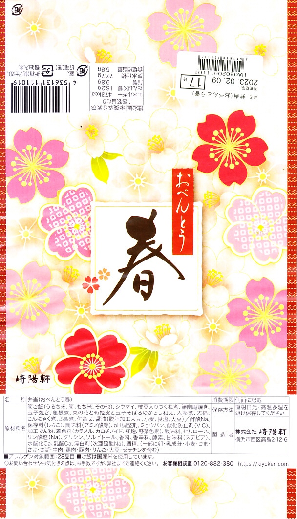 1998(平成10)年に発売された、小柄で安価な横浜駅の春駅弁。これは2023(令和5)年版で、2月1日から4月15日までの販売。春色と桜花でできている掛紙は、絵柄は2014(平成26)年から、形状は2017(平成29)年から変わらない。中身も前年と同じで、タケノコ御飯、サワラの幽庵焼き、彩りつくねの旨煮、ニンジンやフキやレンコンなどの煮物、菜の花やタケノコなどの辛子和え物、玉子焼、桜大根、桜ミニ大福、シウマイ2個。価格は50円アップ。