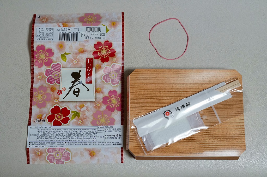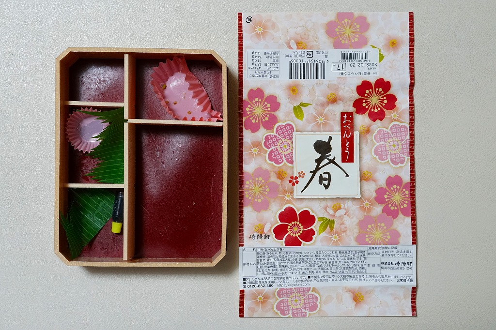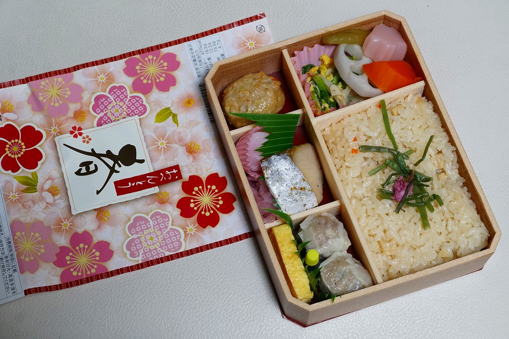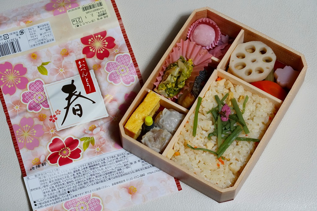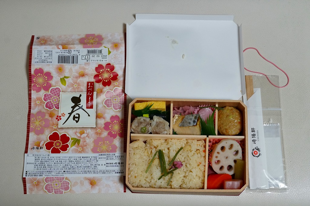 1998(平成10)年に発売された、小柄で安価な横浜駅の春駅弁。これは2022(令和4)年版で、2月1日から4月15日までの販売。春色と桜花でできている掛紙は、絵柄は2014(平成26)年から、形状は2017(平成29)年から変わらない。中身も前年とそっくりで、タケノコ御飯、サワラの幽庵焼き、彩りつくねの旨煮、ニンジンやフキやレンコンなどの煮物、菜の花やタケノコなどの辛子和え物、玉子焼、桜大根、桜ミニ大福、シウマイ2個。