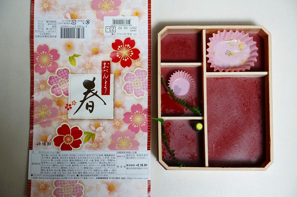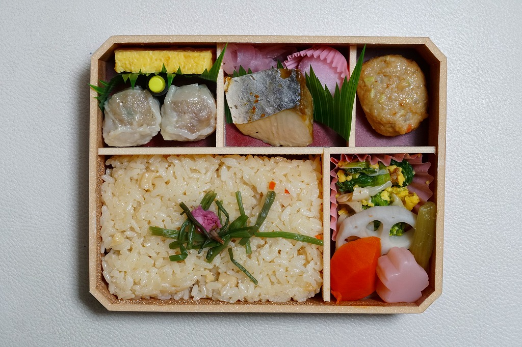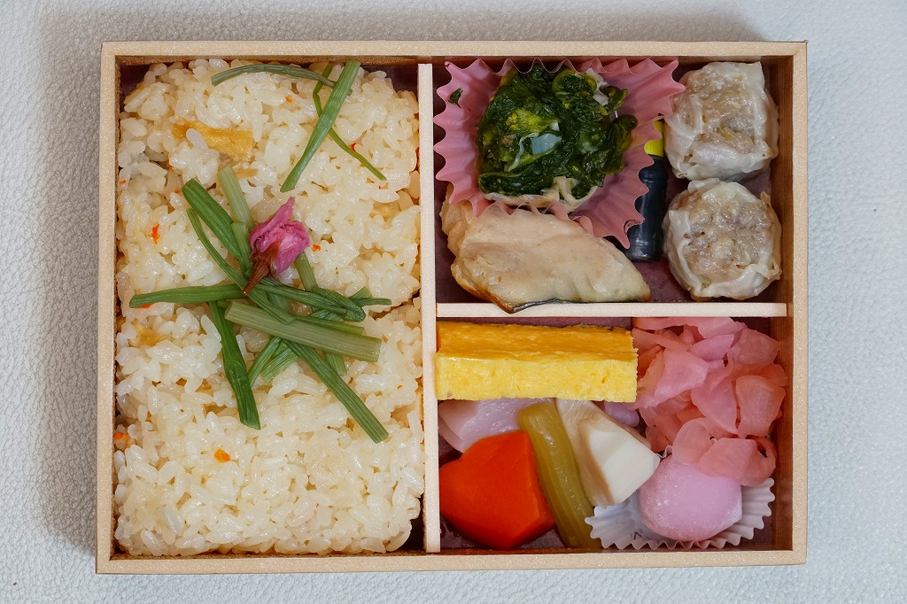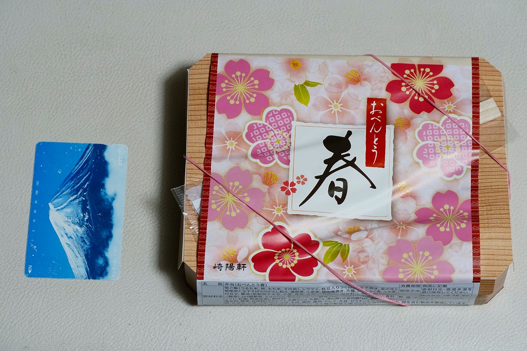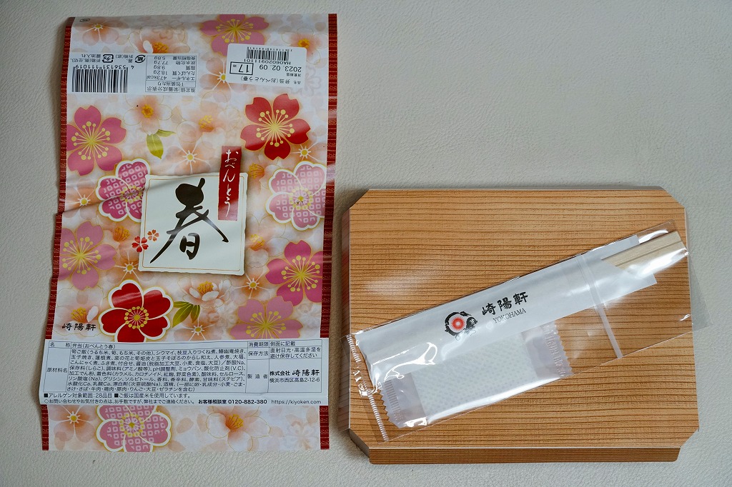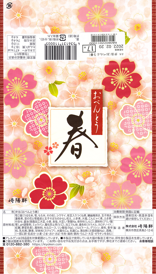1998(平成10)年に発売された、小柄で安価な横浜駅の春駅弁。これは2022(令和4)年版で、2月1日から4月15日までの販売。春色と桜花でできている掛紙は、絵柄は2014(平成26)年から、形状は2017(平成29)年から変わらない。中身も前年とそっくりで、タケノコ御飯、サワラの幽庵焼き、彩りつくねの旨煮、ニンジンやフキやレンコンなどの煮物、菜の花やタケノコなどの辛子和え物、玉子焼、桜大根、桜ミニ大福、シウマイ2個。