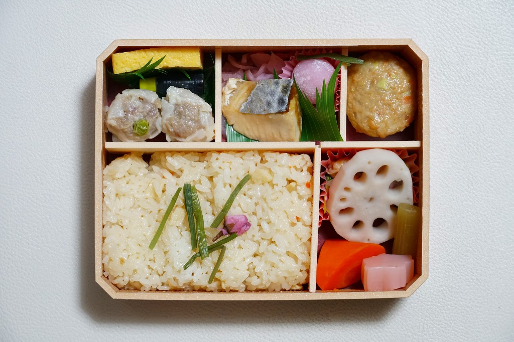 横浜駅などで1月から5月まで売られる、春季限定の駅弁。写真は2002(平成14)年版で、春らしい桜色の掛紙をかけた小ぶりな正方形の容器の中身は、あさり御飯とシウマイ2個、筍や人参の煮物に海老や玉子焼、そして白身魚のかけらもち揚げなど。一品一品が小ぶりながら素材の味を生かしていて高級感がある、量も風味も女性向けの駅弁。