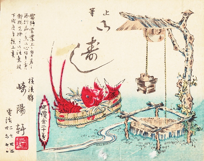おそらく1920年代、大正10年代のものと思われる、昔の横浜駅弁の掛紙。収集者は1920(大正9)年のものとした。木桶に盛られる笹と鯛と伊勢海老に井戸が描かれているように見えるが、これは何を意味するのだろうか。