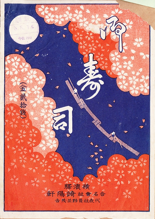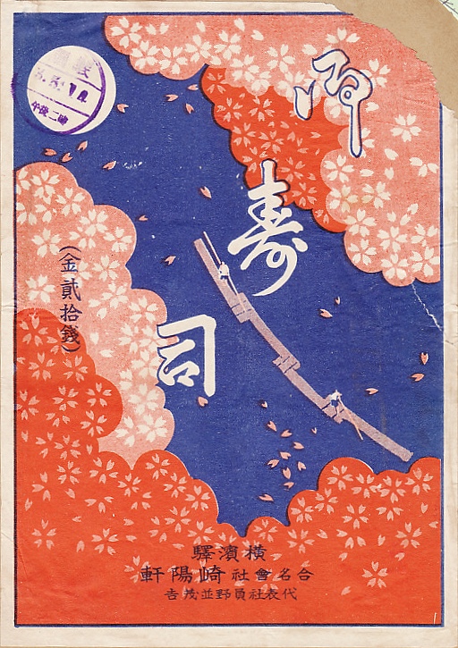 1928(昭和3)年5月14日16時の調製と思われる、昔の横浜駅弁の掛紙。桜と水面と舟か何かの絵柄か。1915(大正4)年8月の横浜駅の高島町への移転と同時に、久保コトの崎陽軒は野並茂吉の匿名組合崎陽軒となり、1923(大正12)年5月には法人組織の合名会社崎陽軒となった。