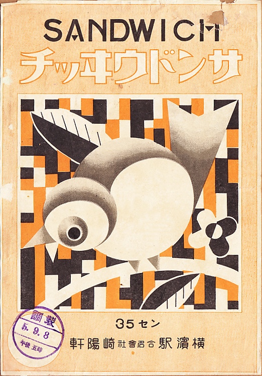 1930(昭和5)年9月8日17時の調製と思われる、昔の横浜駅弁の掛紙。おそらく中身と関係なく、スズメか何かの鳥を現代アートのように描く。