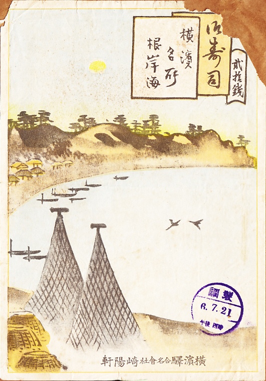 1931(昭和6)年7月21日の調製と思われる、昔の横浜駅弁の掛紙。横浜名所根岸海の風景を描く。横浜市根岸には、1959(昭和34)年に工業地帯の造成のための埋立が始まるまでは遠浅の砂浜があり、海水浴や潮干狩りなどの行楽で賑わい、エビやアナゴやシャコに海苔の養殖など江戸前と同じ漁業が盛んだった。その頃の光景が、ここに描かれる。