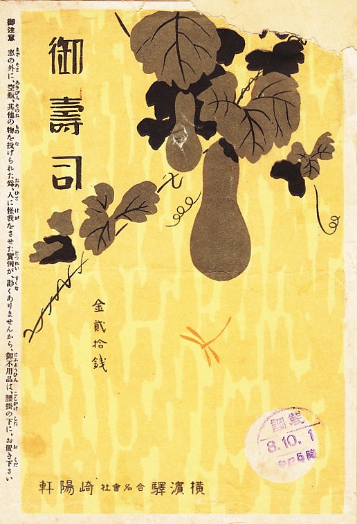 1930(昭和5)年3月25日9時の調製と思われる、昔の横浜駅弁の掛紙。マグロとホタテと木桶と笹を描いているように見える。駅名と定価の記載はあるが、鉄道に関する注意書きがないので、駅弁でなく市中の弁当向けの掛紙かもしれない。