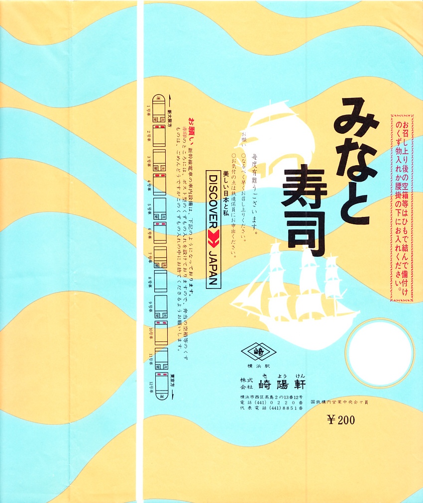 1970年代のものと思われる、昔の横浜駅弁の掛紙。調製元の所に「横浜駅」と書かれるが、新幹線12両編成の編成図を記すため、新横浜駅での販売分のものか。新横浜駅は1976年7月まで「こだま」のみが停車し、その編成は1973年8月までに12両から16両に増え、掛紙に1970年からの国鉄のキャンペーン「ディスカバー・ジャパン」のロゴがあるため、その間のものだろう。絵柄そのものは、横浜駅などのものと同じ。みなとずしは1969年頃から2000年まで横浜駅や川崎駅で販売された駅弁だった。