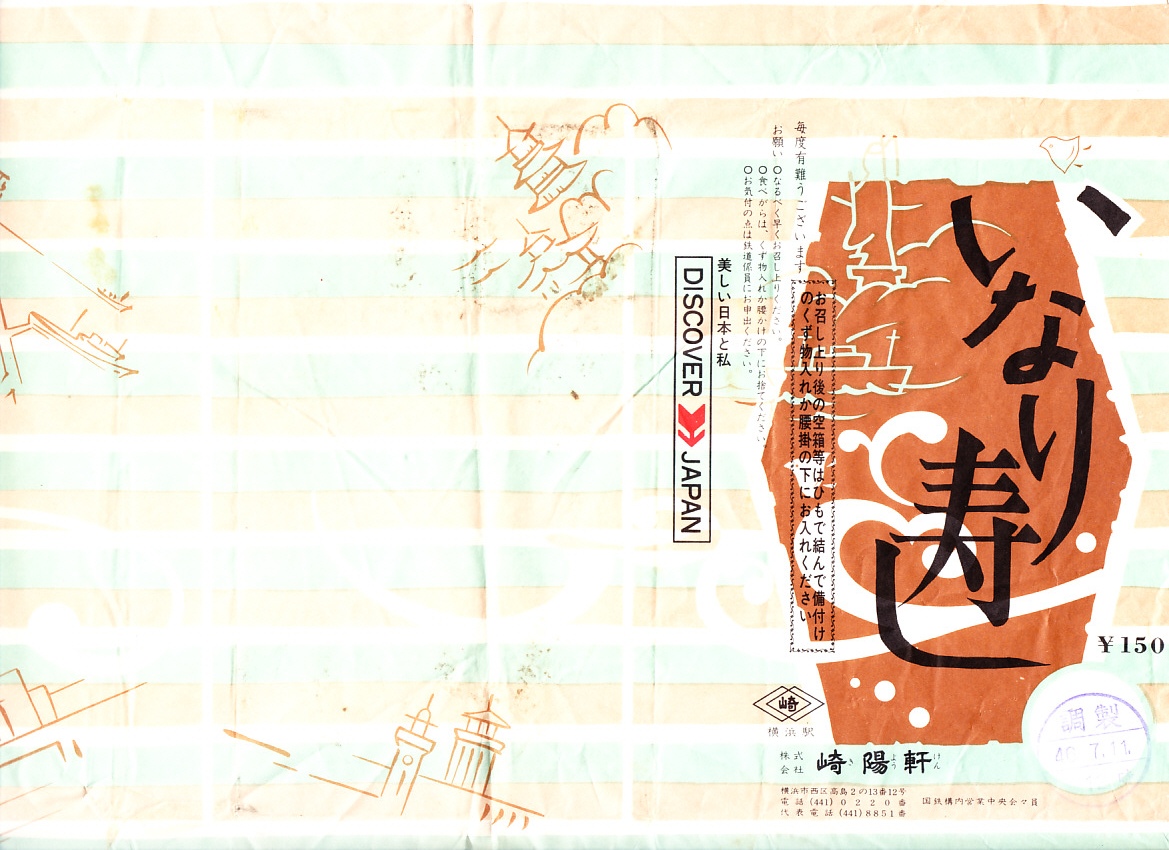1972(昭和47)年1月23日12時の調製と思われる、昔の横浜駅弁の掛紙。2001(平成13)年8月1日発売の「いなりずし(500円)」の掛紙に、この六角形の背景と文字の絵柄が流用された。