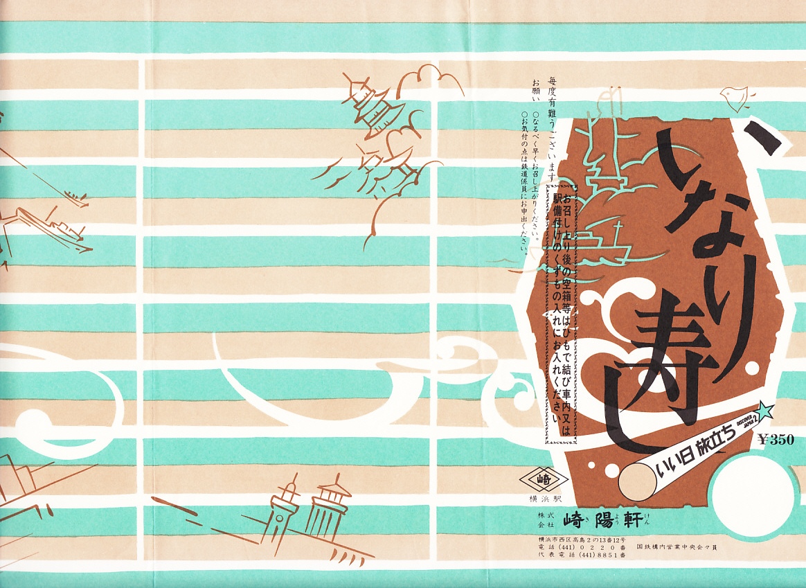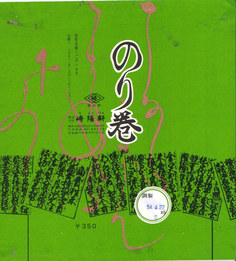 1979(昭和54)年4月22日8時の調製と思われる、昔の横浜駅弁の掛紙。駅弁の名前に「のり巻」が付く駅弁は、もう伊東駅弁だけの存在かもしれない。新幹線と特急列車の時代になり、急行や鈍行の時代に書かれていた、空箱を腰掛の下に置くことを勧める注意書きはもうここにはない。
