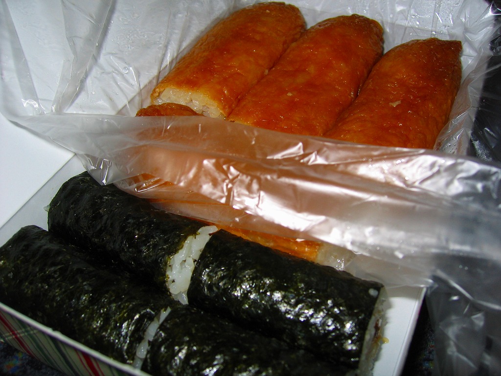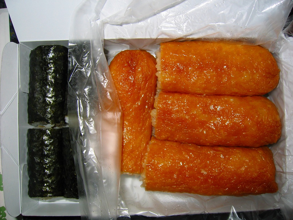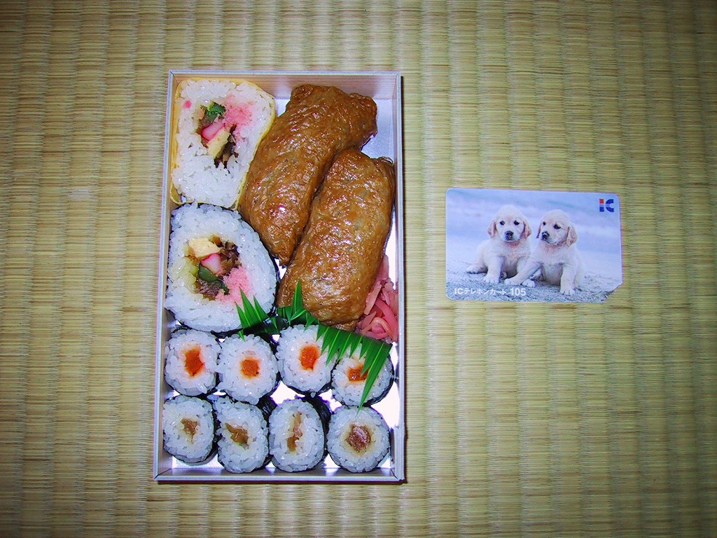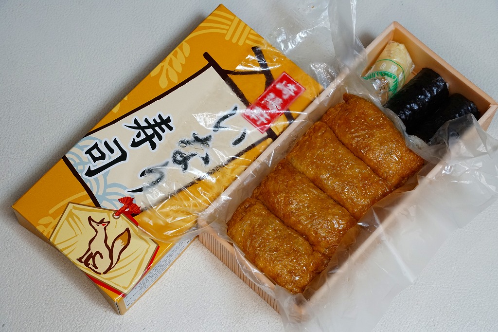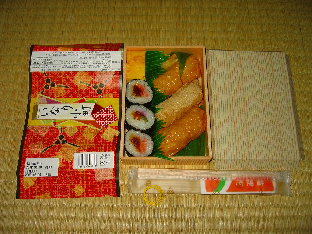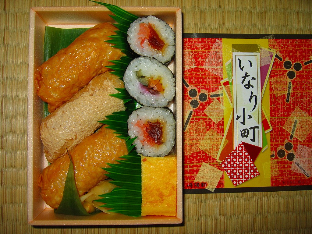 外観からはいなり寿司を想像するが、長方形の木製風紙容器に入るいなり寿司はふたつだけ。同じく太巻も海苔巻きと玉子巻きのふたつだけで、メインは実は細巻きである。2001年8月に上記の駅弁「いなりずし」へリニューアル。