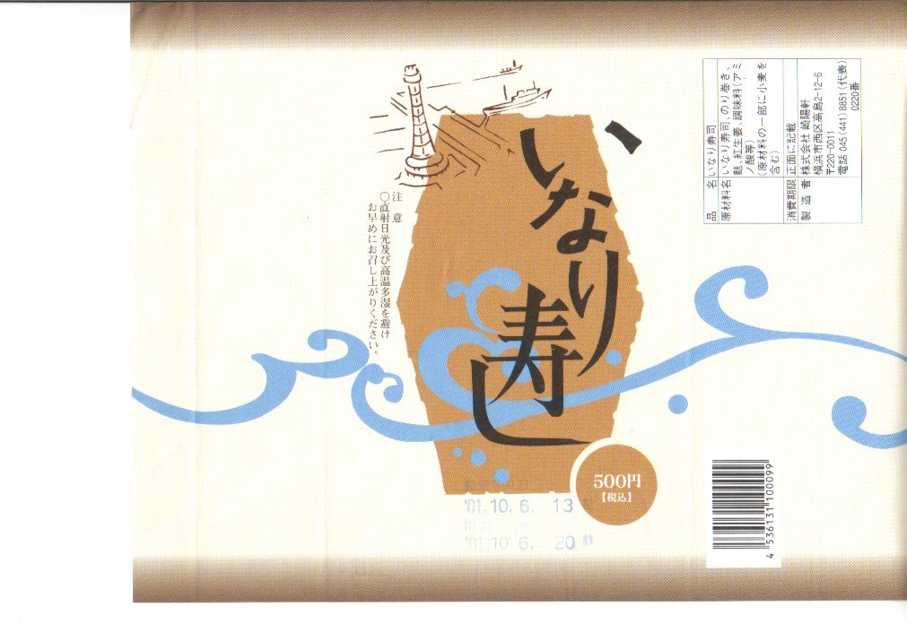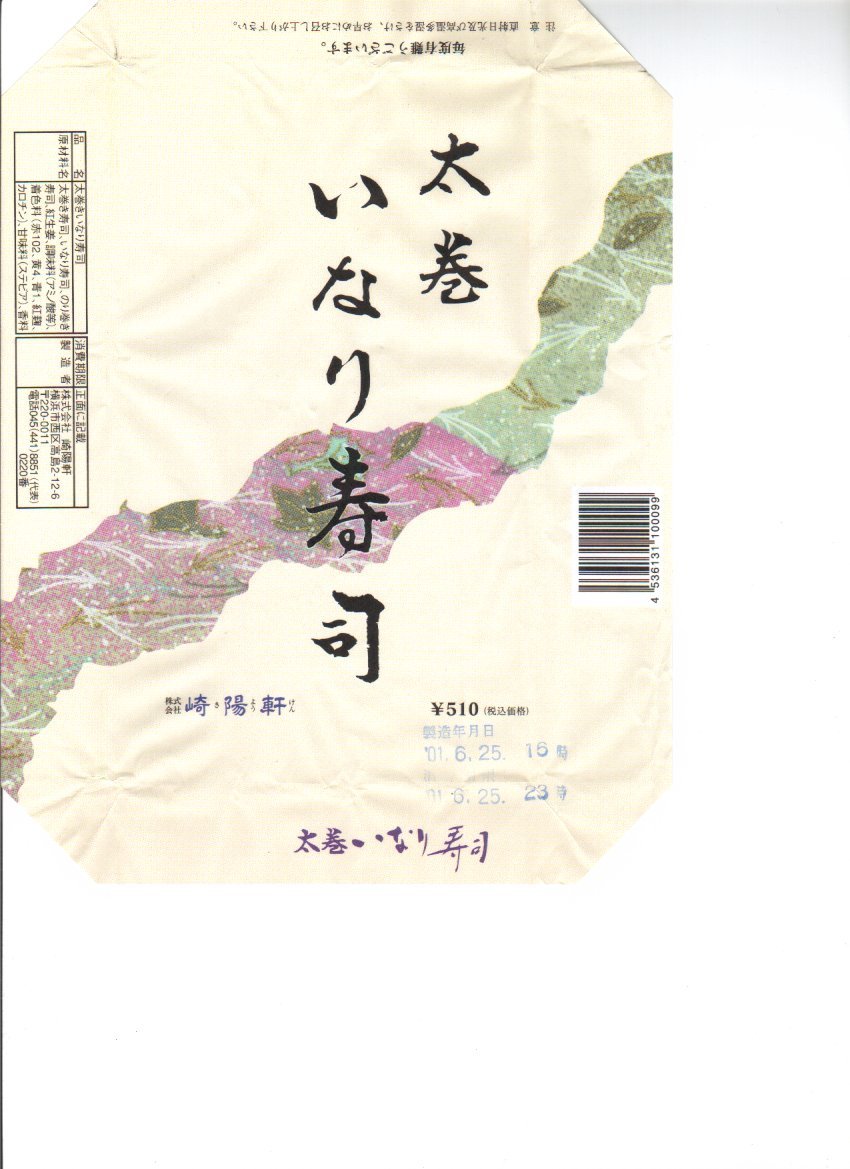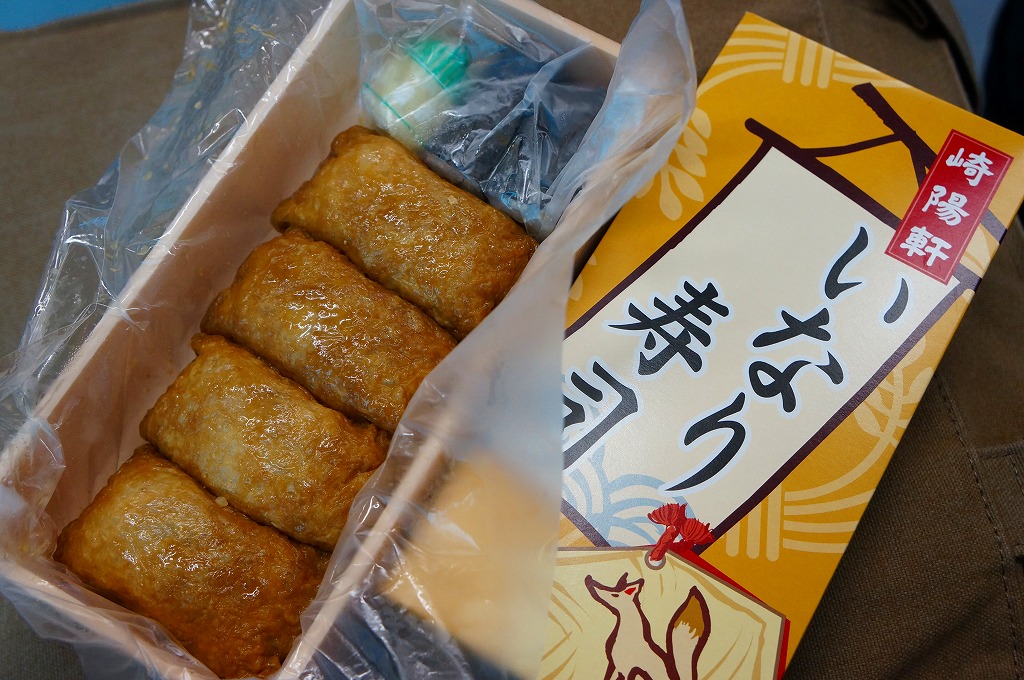 2001(平成13)年8月1日に従前の駅弁「太巻いなり寿司」をリニューアル。昭和40年代のものをデザインした掛紙をかける。いなり寿司が4個と、かんぴょうの細巻が4個で、駅弁の名前と中身が合ってきたが、ごわごわ感のあるいなり寿司など、食感や風味は東海道本線下り方面のいなり寿司駅弁には及ばず、シウマイや中華弁当の崎陽軒なので、餅は餅屋にという感じがしないでもない。2003年11月に上記の駅弁「三色いなり寿司」へリニューアル。