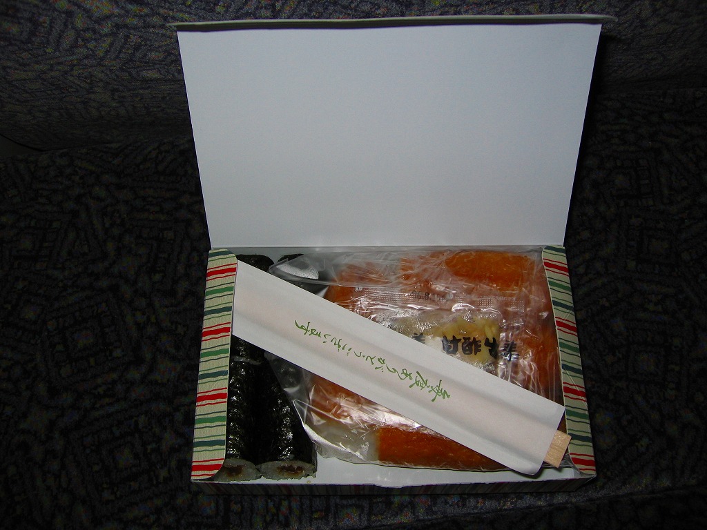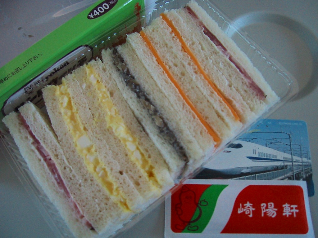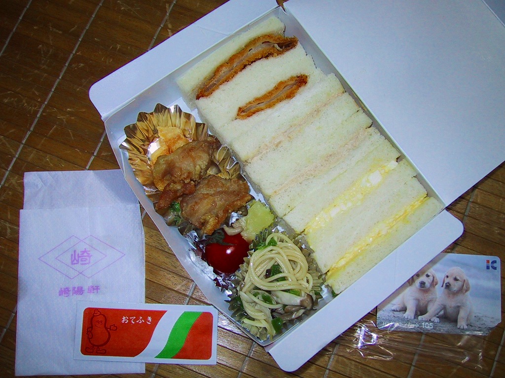 サンドイッチだけ入っていると思い購入すると、ツナ・玉子・カツのサンドがふたつづつに加え、唐揚げ・ポテト・しめじパスタにミニトマトやパイナップルも入る、食べ飽きない構成にうれしかった。サンドイッチ6切れだけで700円も取る東海道新幹線の車販サンドよりこちらを買いたいが、昼以降はたいてい売り切れている。2002年4月19日におかずのない「サンドウィッチ」(400円)に置き換えられた。