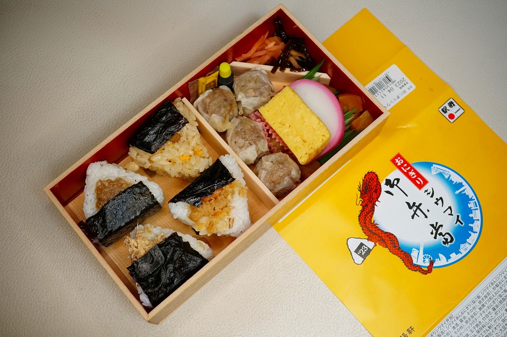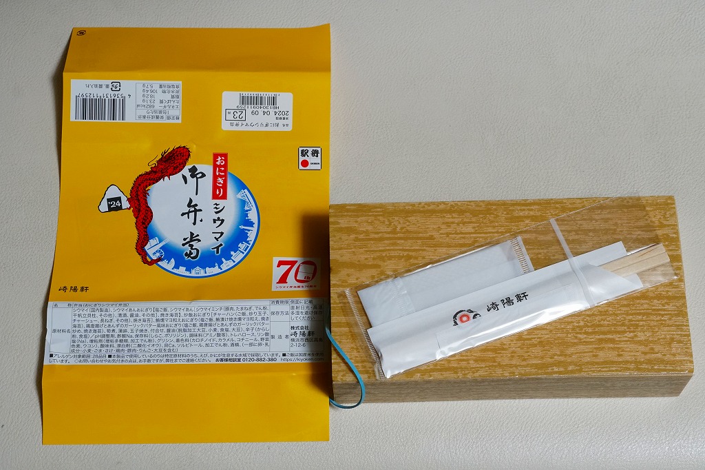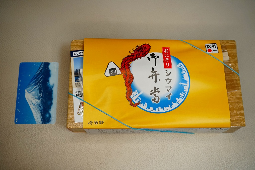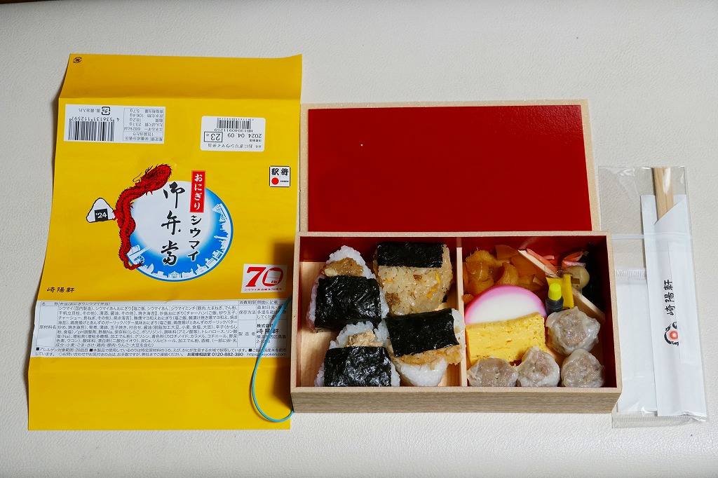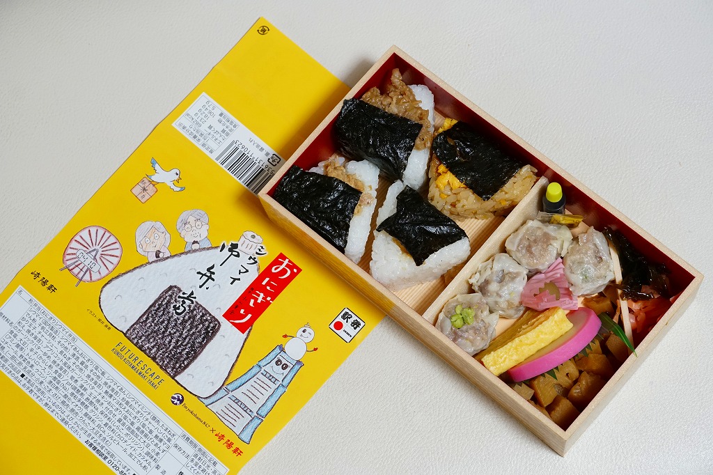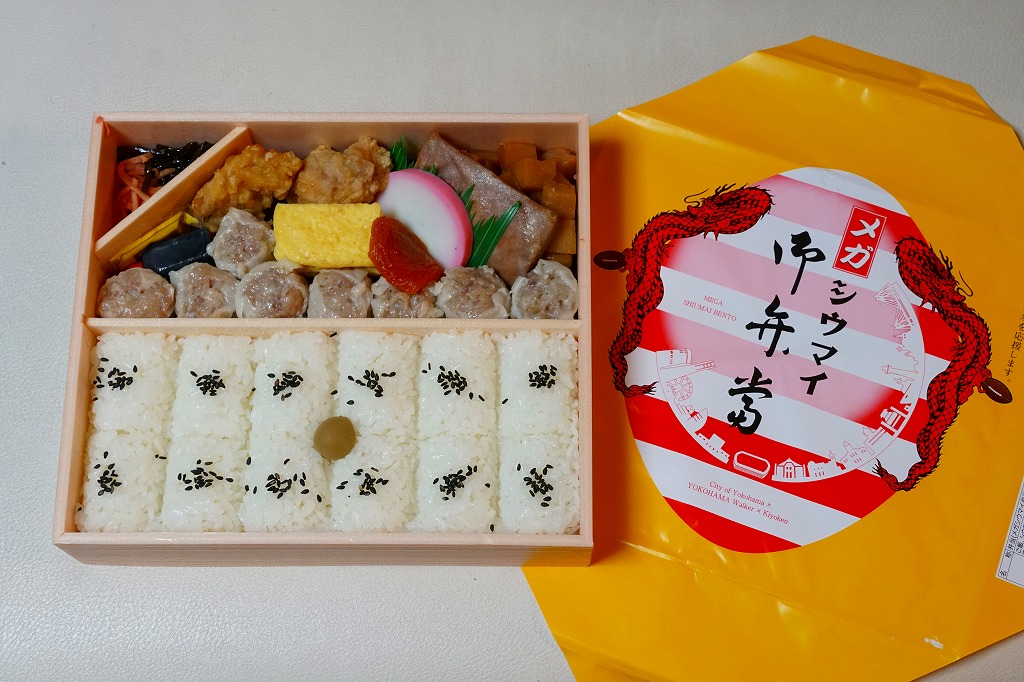 商品名は「おにぎりシウマイ弁当」とも。今回は2024(令和6)年4月8日から10日まで、調製元のネット通販での完全予約制で、約130店舗にて4,200個を販売。今回も駅弁の日に合わせ、日本鉄道構内営業中央会の会員のうち31社が各社おすすめ駅弁に共通ノベルティ「千社札風カード」を添付して期間限定で販売した駅弁の、横浜駅バージョンになった。
