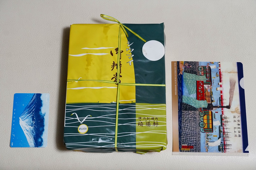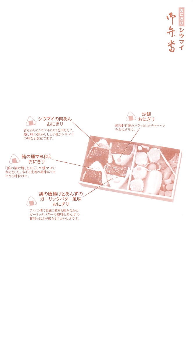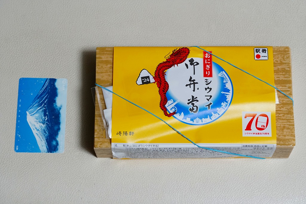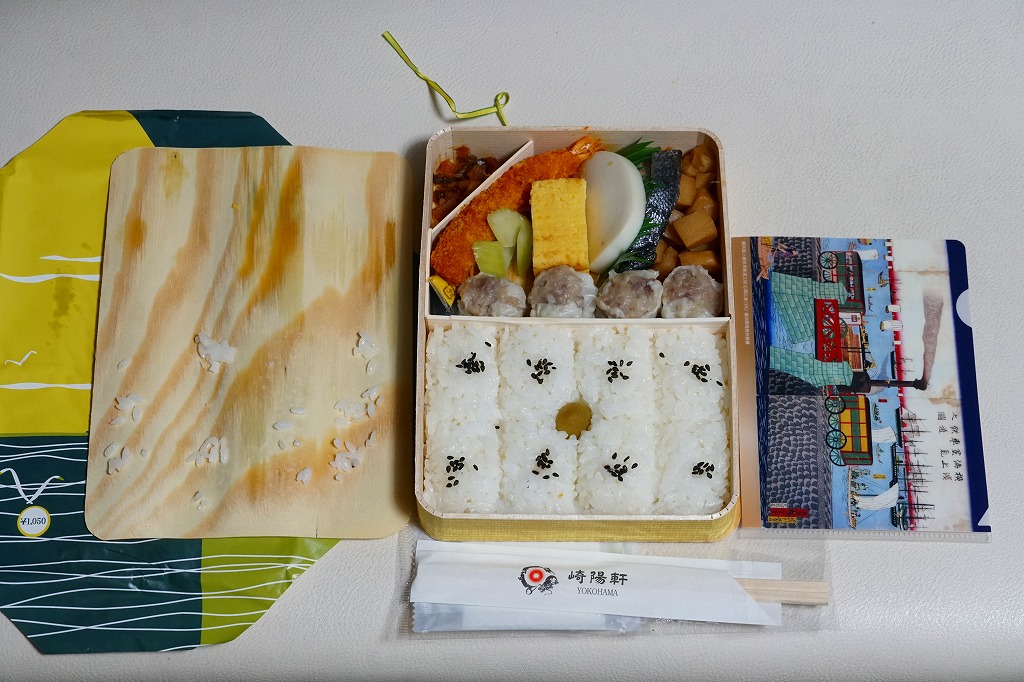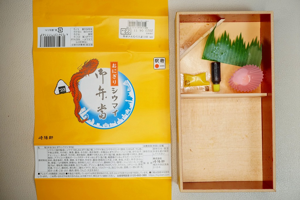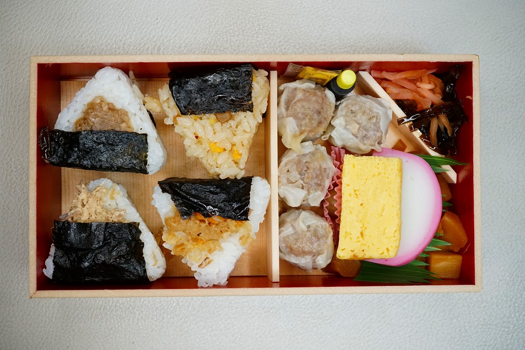 商品名は「おにぎりシウマイ弁当」とも。今回は2024(令和6)年4月8日から10日まで、調製元のネット通販での完全予約制で、約130店舗にて4,200個を販売。今回も駅弁の日に合わせ、日本鉄道構内営業中央会の会員のうち31社が各社おすすめ駅弁に共通ノベルティ「千社札風カード」を添付して期間限定で販売した駅弁の、横浜駅バージョンになった。