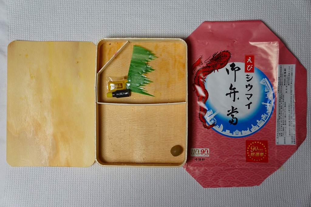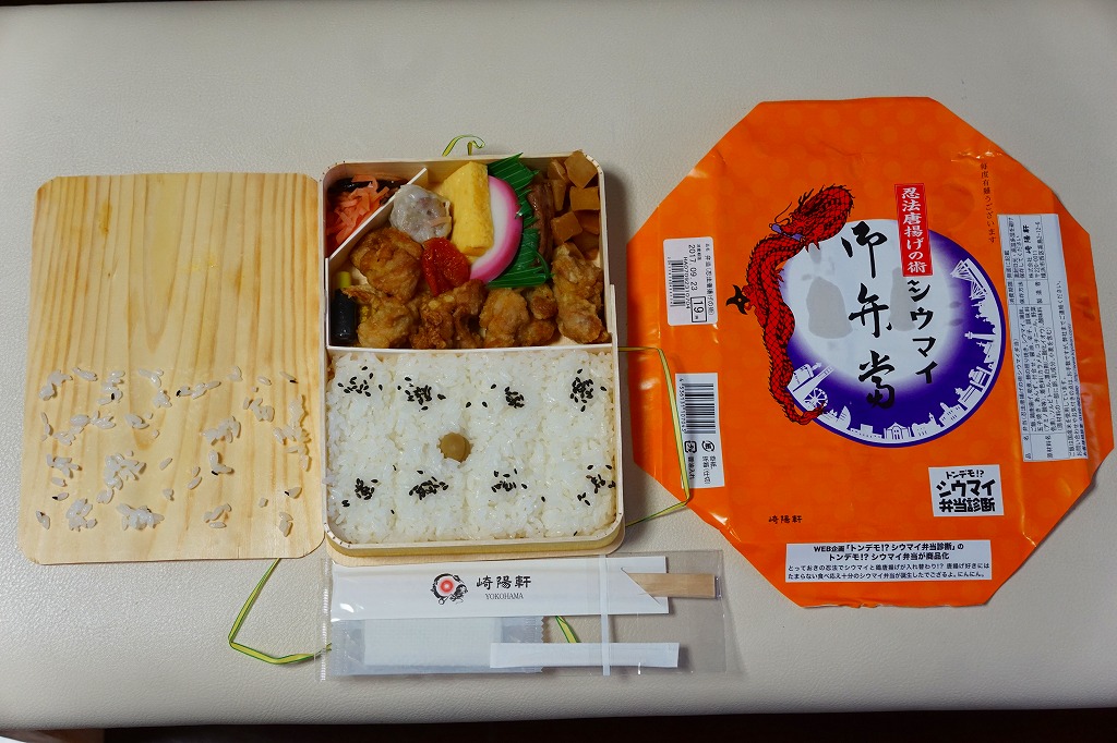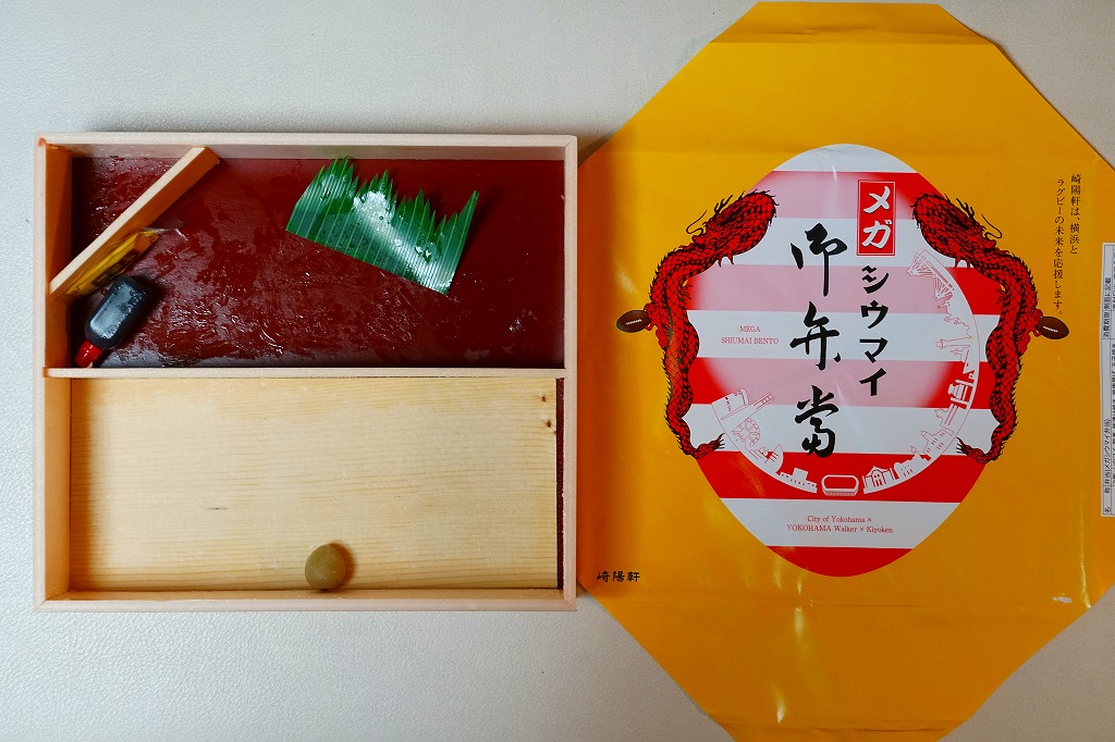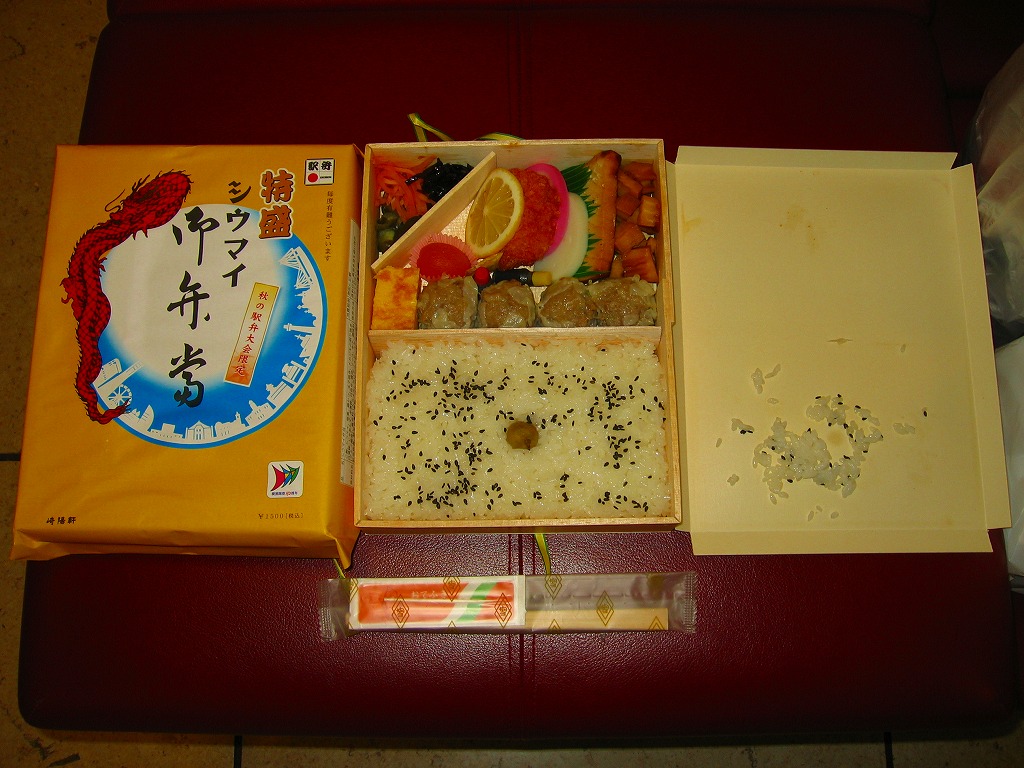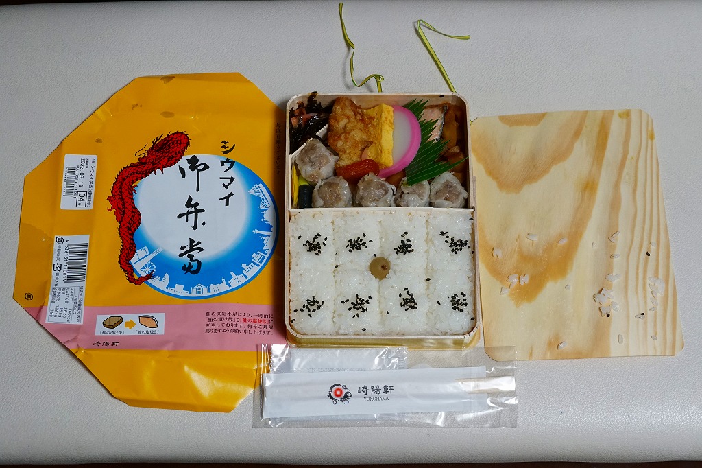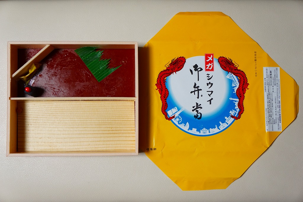 容器と掛紙とひもの幅を、1.5倍くらいに拡大した感じ。中身も俵飯を8個から12個に、シウマイを5個から8個に、マグロ照焼を1.5倍大に、鶏唐揚を1個から2個に、玉子焼の厚さを2倍に、タケノコ煮の分量を1.5倍に、切り昆布と千切り生姜を2倍にしたという。分量以外は通常版と同じなので、味もまったく同じ。容器は経木折とならなかったものの、内ふたと飯の底に経木を使っていた。
