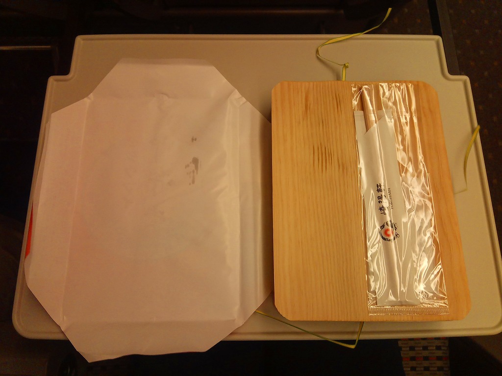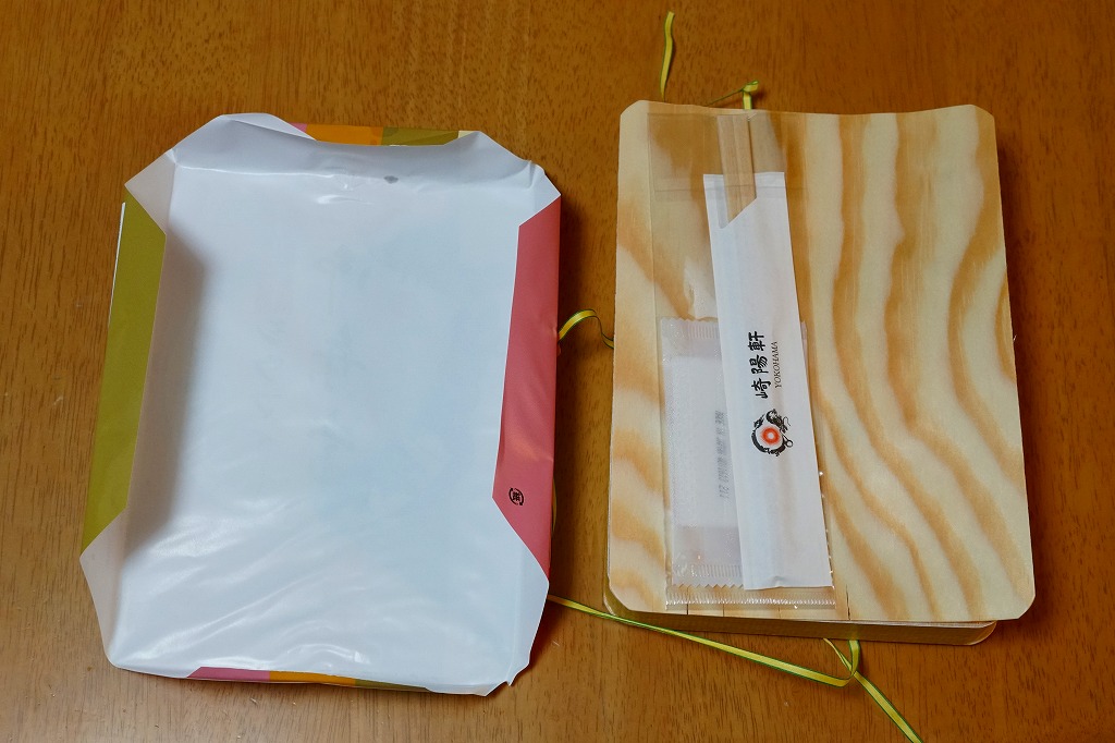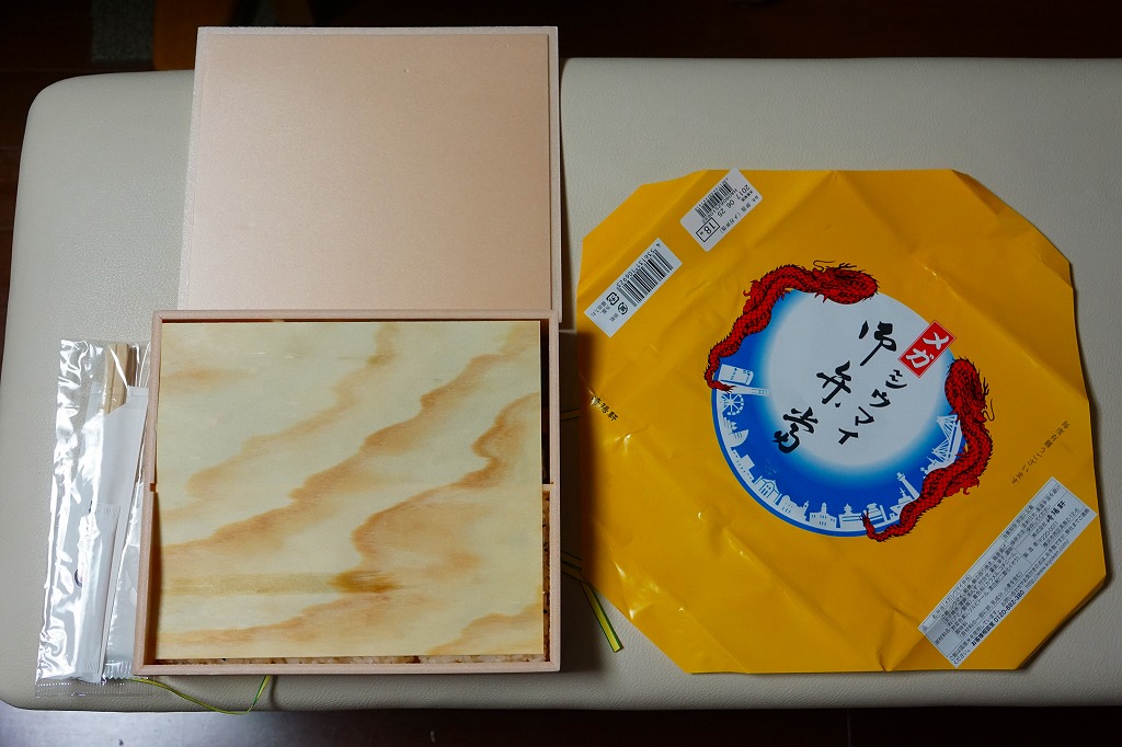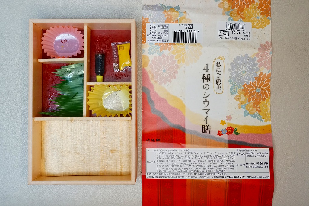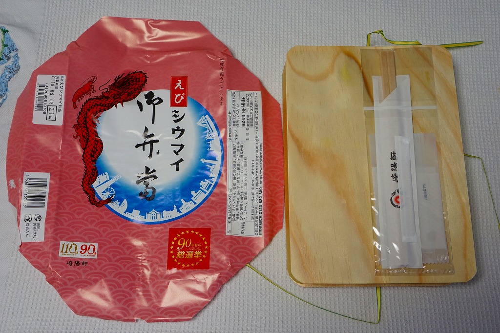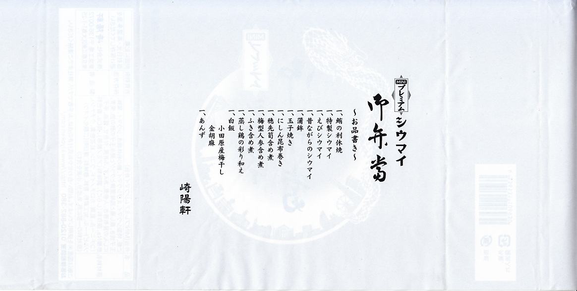 容器と掛紙とひもの幅を、1.5倍くらいに拡大した感じ。中身も俵飯を8個から12個に、シウマイを5個から8個に、マグロ照焼を1.5倍大に、鶏唐揚を1個から2個に、玉子焼の厚さを2倍に、タケノコ煮の分量を1.5倍に、切り昆布と千切り生姜を2倍にしたという。分量以外は通常版と同じなので、味もまったく同じ。容器は経木折とならなかったものの、内ふたと飯の底に経木を使っていた。