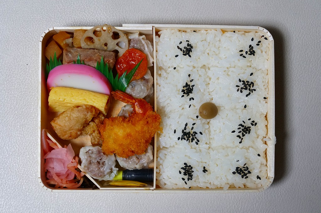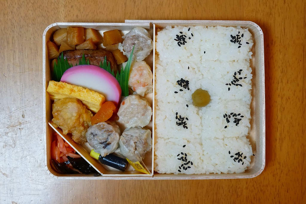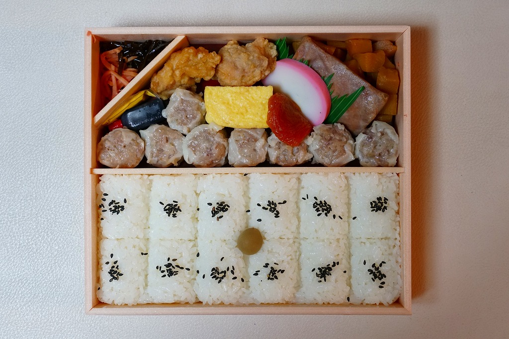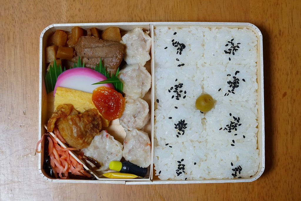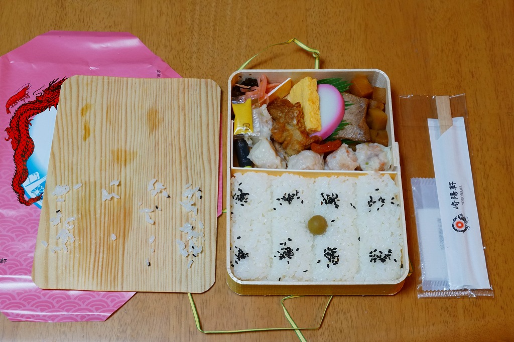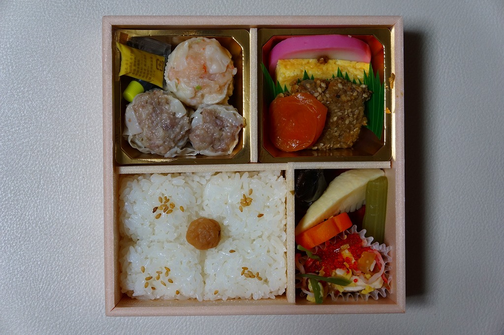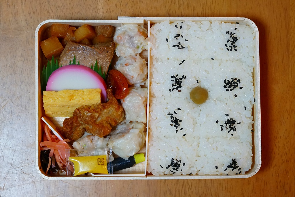俵飯こそ日の丸ゴマ降り御飯に簡略化されているが、シウマイ5個は4個の特製シウマイに、蒲鉾は紅白各1切れに、玉子焼の厚さは3倍に、マグロ照焼の面積も2倍以上か、アンズは干さずに体積を増し、タケノコと付合せはそのまま増量、鶏唐揚に替えて鶏フライを添付し、容器の外枠と間仕切りは経木を確保した。