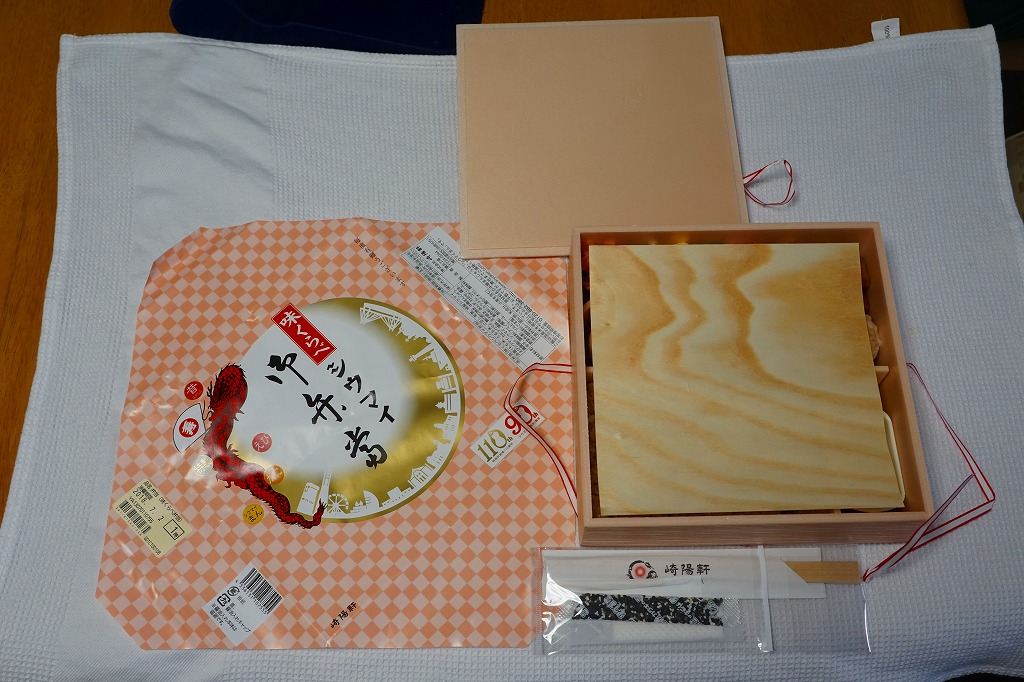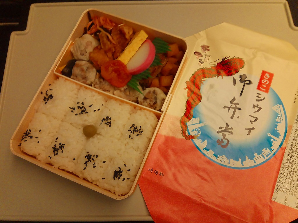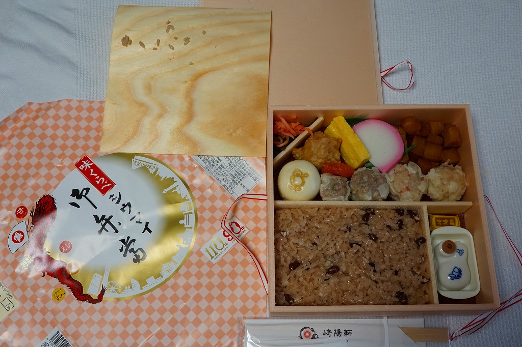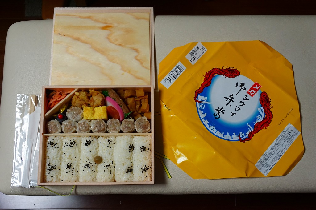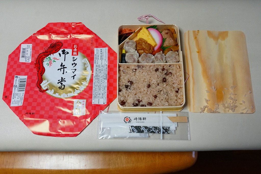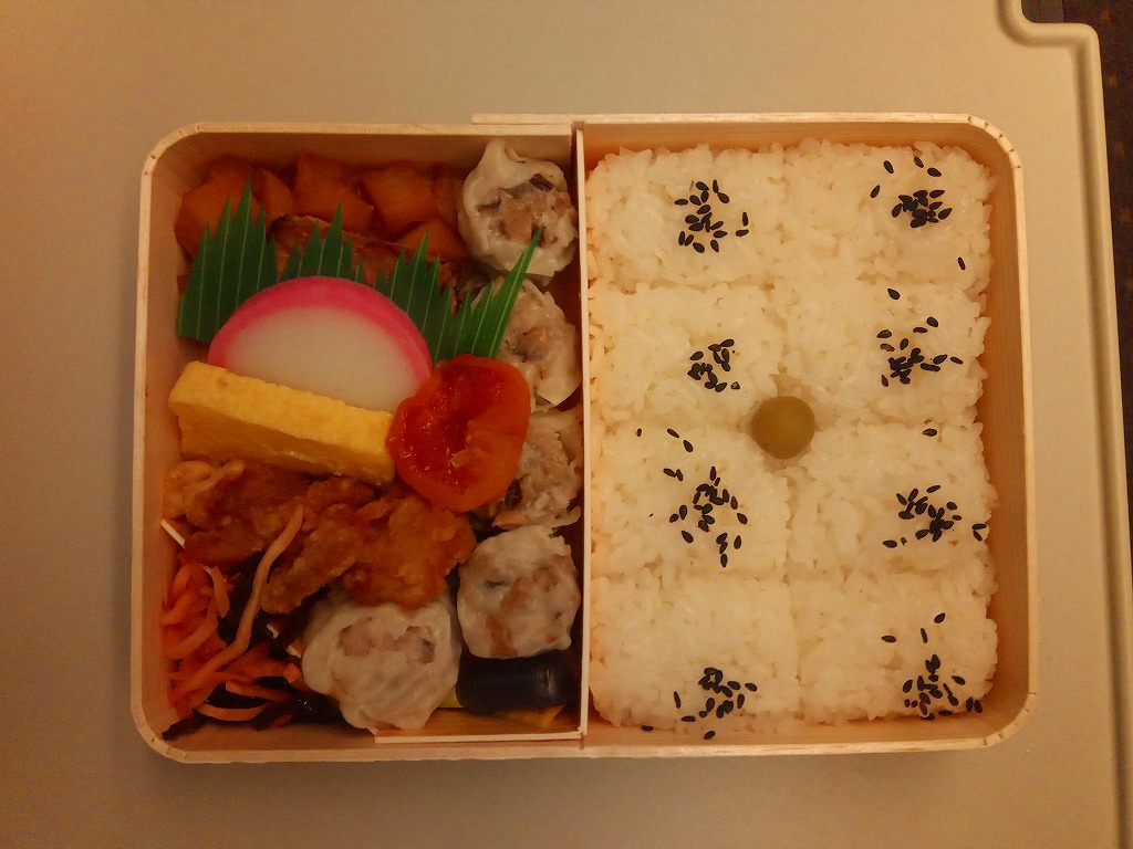 俵飯こそ日の丸ゴマ降り御飯に簡略化されているが、シウマイ5個は4個の特製シウマイに、蒲鉾は紅白各1切れに、玉子焼の厚さは3倍に、マグロ照焼の面積も2倍以上か、アンズは干さずに体積を増し、タケノコと付合せはそのまま増量、鶏唐揚に替えて鶏フライを添付し、容器の外枠と間仕切りは経木を確保した。