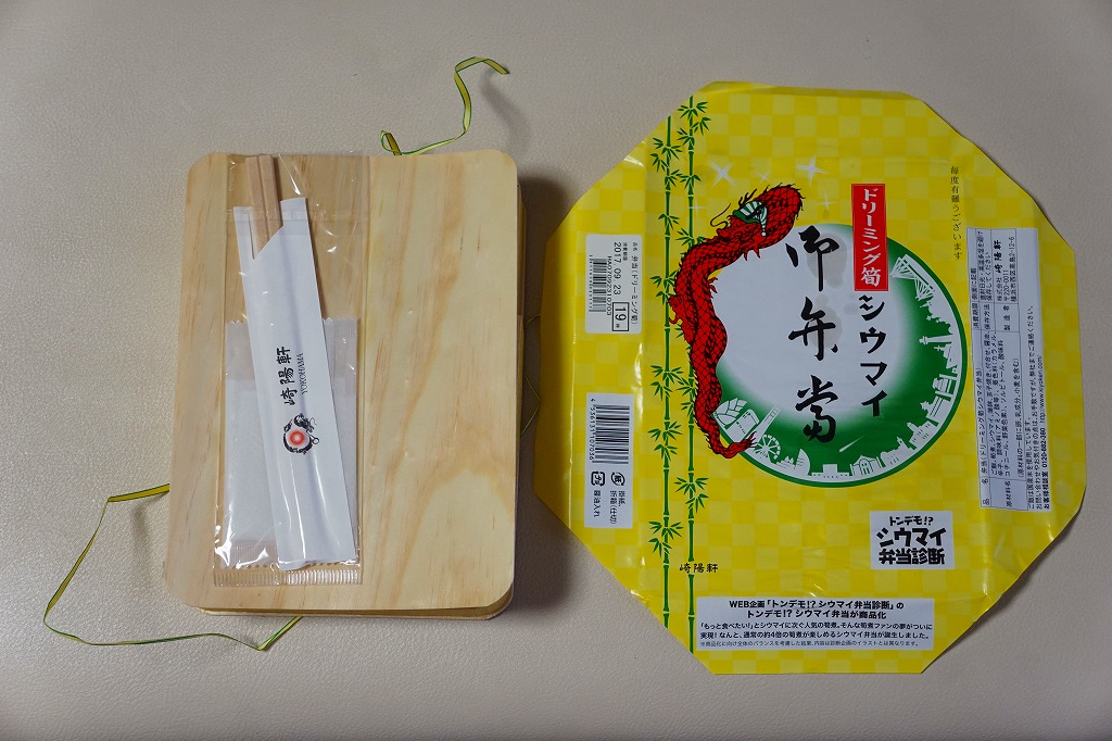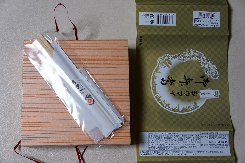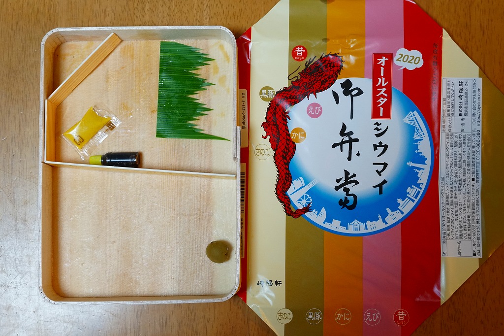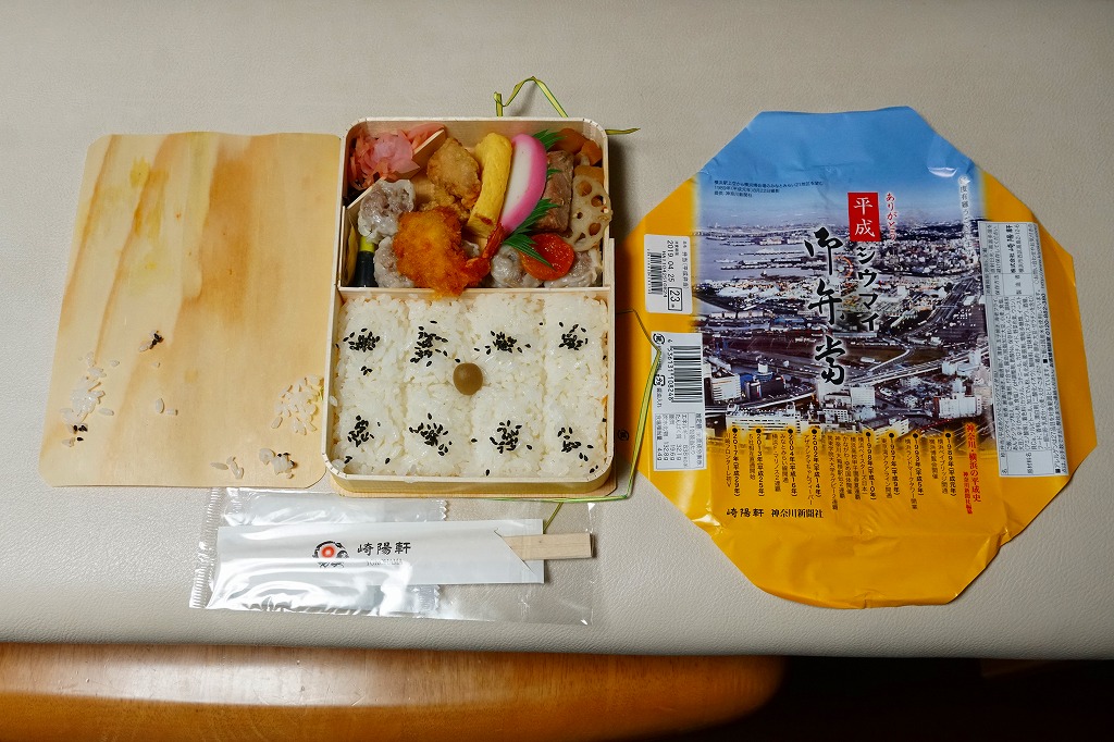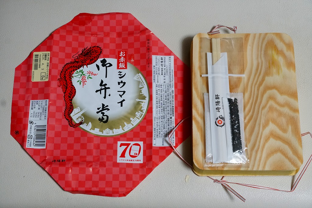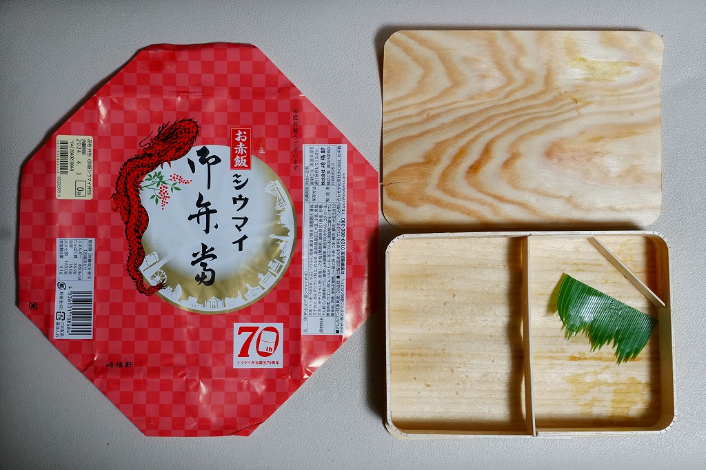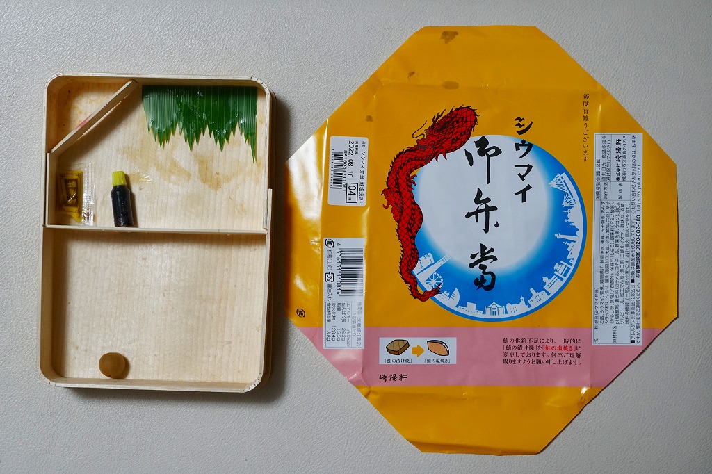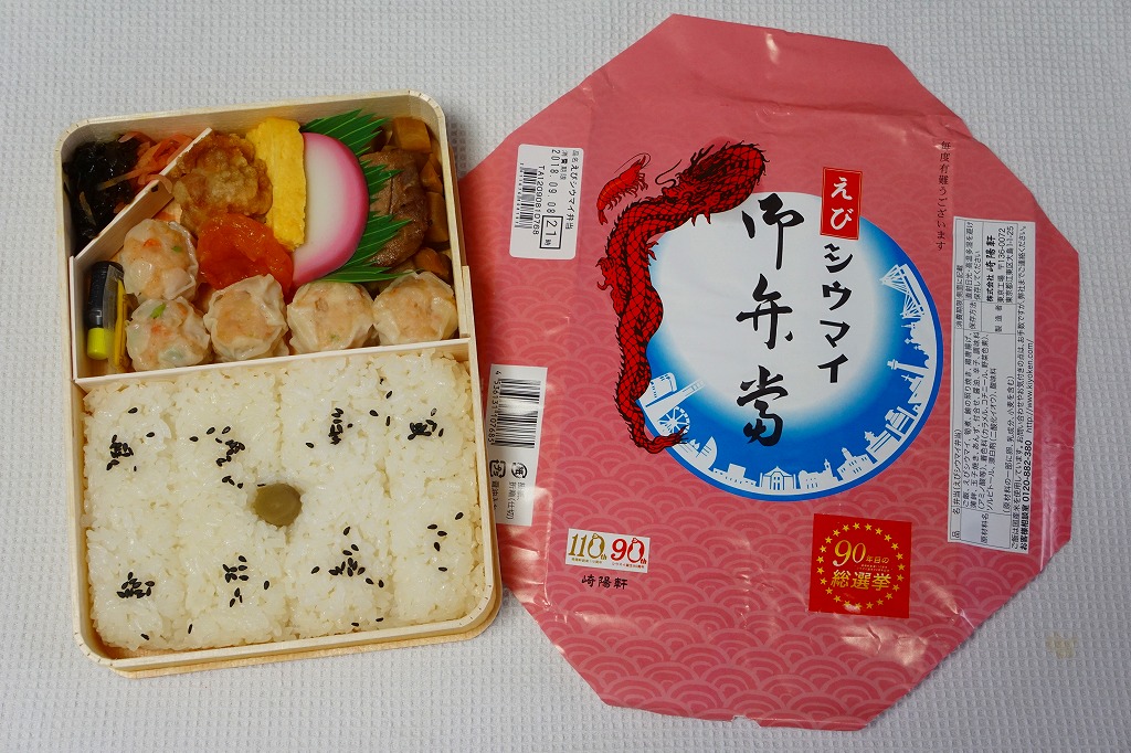 過去に東京で復刻されたものと同じく、普段の経木折を初代の絵柄を持つ掛紙で包み、いつもどおりひもでしばる。その復刻掛紙の価格表示に、今回の値段を書き入れた。中身は日の丸俵飯に玉子焼、筍煮、ブリ照焼、海老フライ、かまぼこ、セロリの浅漬け、福神漬、昔ながらのシウマイ4個。普段のシウマイ弁当より、150円高かった。
