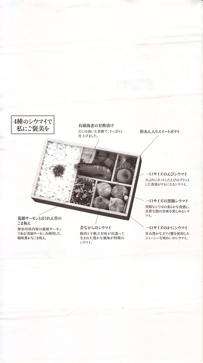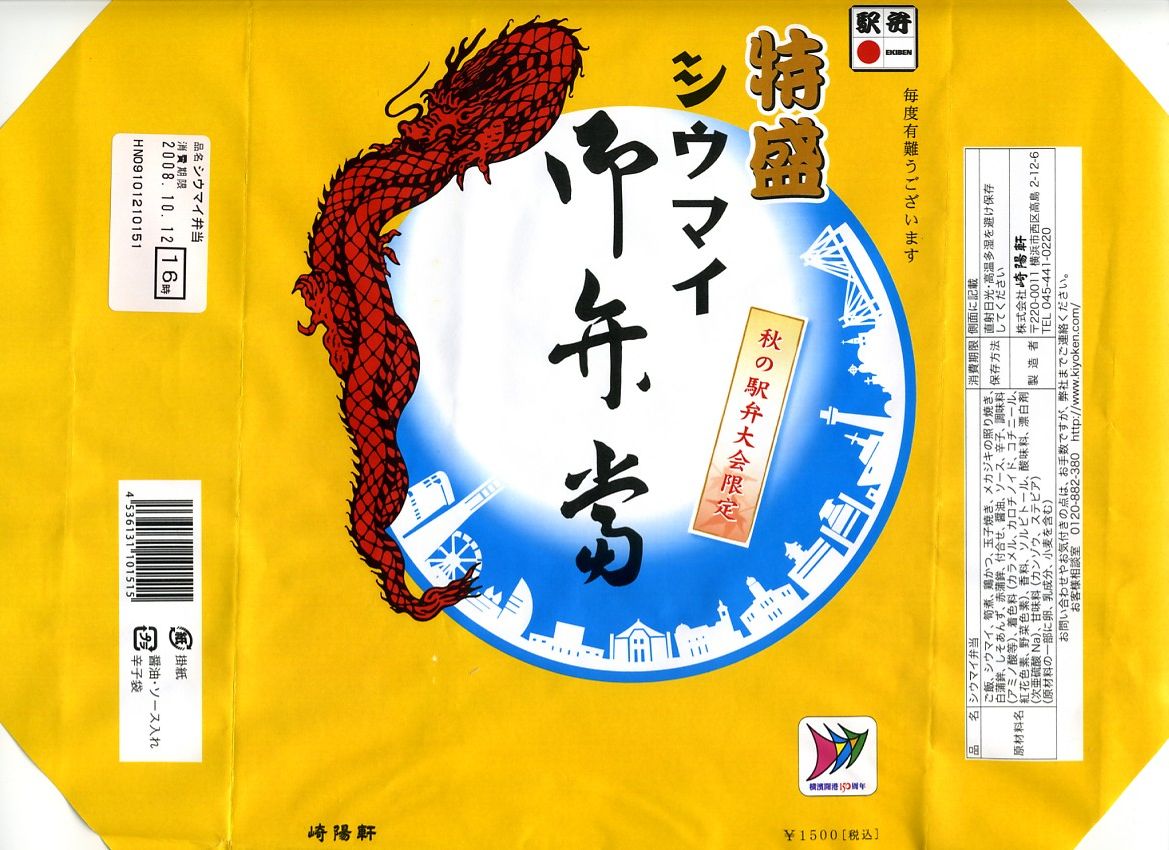 2008年10月12・13日に東京駅構内で開催された「東日本縦断駅弁大会−秋−」で販売されたお弁当。メガ駅弁をテーマに、横浜駅のシウマイ弁当を拡大コピーした。横浜でも何かのイベントにつけて限定販売すれば、少なくとも神奈川新聞の記事とTVKのニュースになるはず。