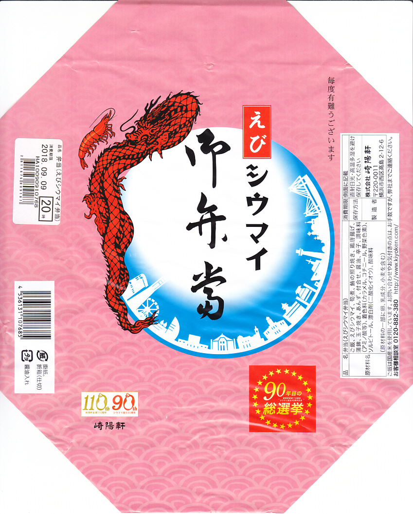 2018(平成30)年9月7日から13日まで販売。同年7月に調製元が自社公式サイト内で実施した人気投票企画「崎陽軒 創業110周年・シウマイ誕生90周年記念 90年目の総選挙」で、「昔ながらのシウマイ」に次ぎ投票数が多かった「えびシウマイ」を、期間限定でシウマイ弁当にした。