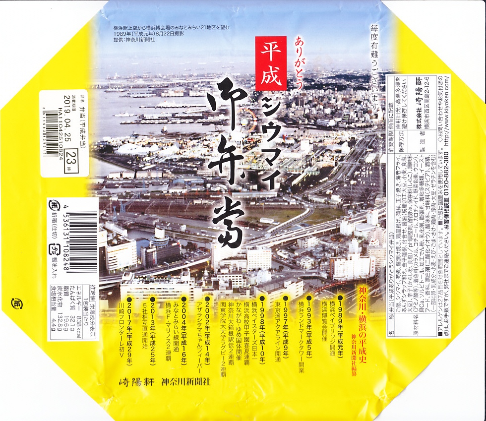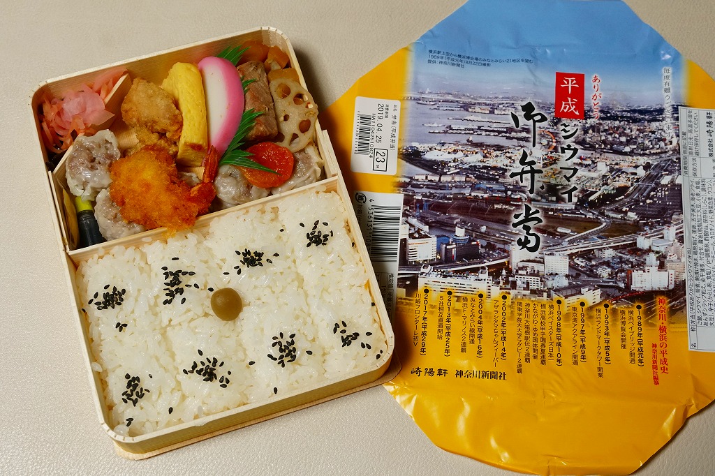 2019(平成31)年4月20日から30日まで販売。駅弁の名前のとおり、平成最後の11日間に売られた駅弁。掛紙には昭和64年の開催予定で1989(平成元)年の3月から10月まで横浜市内のみなとみらい21地区で開催された、横浜市制100周年と横浜港開港130周年を記念した地方博「横浜博覧会」の俯瞰写真を使い、平成時代の横浜の略年表を掲載した。