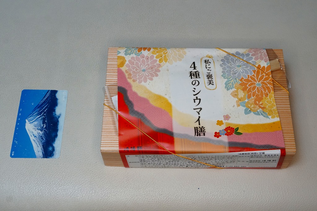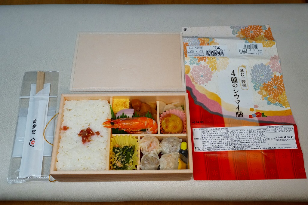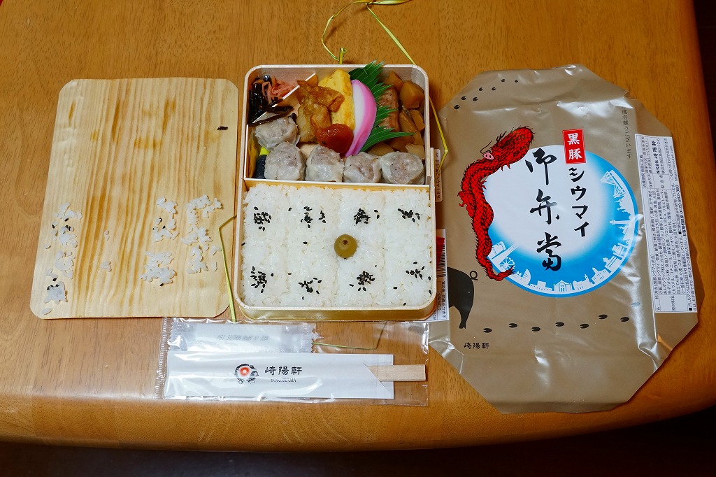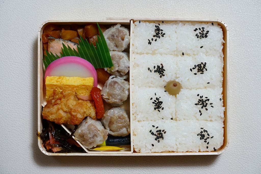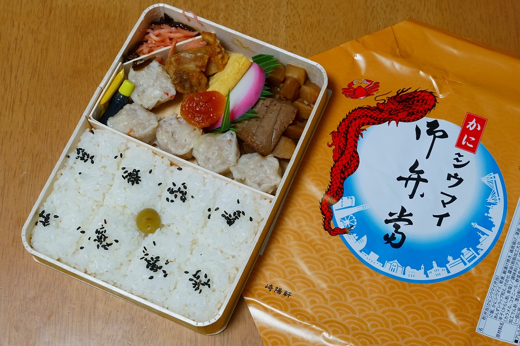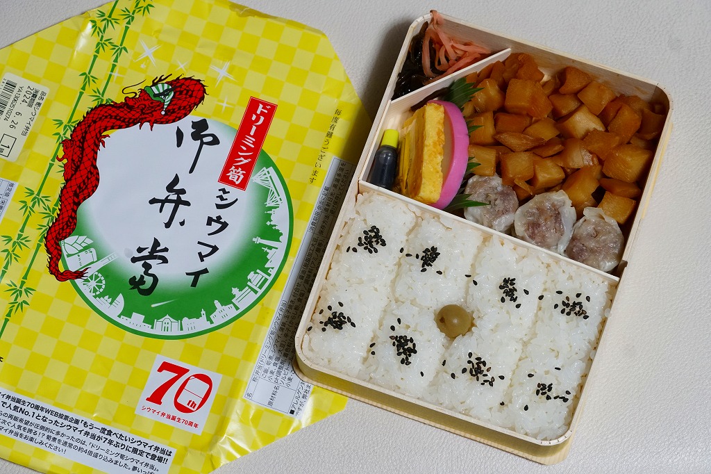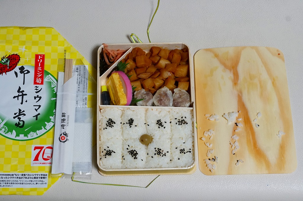 いつもより小柄な弁当箱に、絵柄を流用しながら金色に輝かせた掛紙を巻く。中身は小田原梅干の俵飯に、シウマイと特製シウマイとえびシウマイ、マグロ利休焼、蒸し鶏の彩り和え、タケノコなどの煮物、ニシン昆布巻という感じで、通常版の具の多くを少し上質にした。飛び抜けて高級にしたわけでもないので、通常版よりミニというわけでも、プレミアムというわけでもないような感じだった。