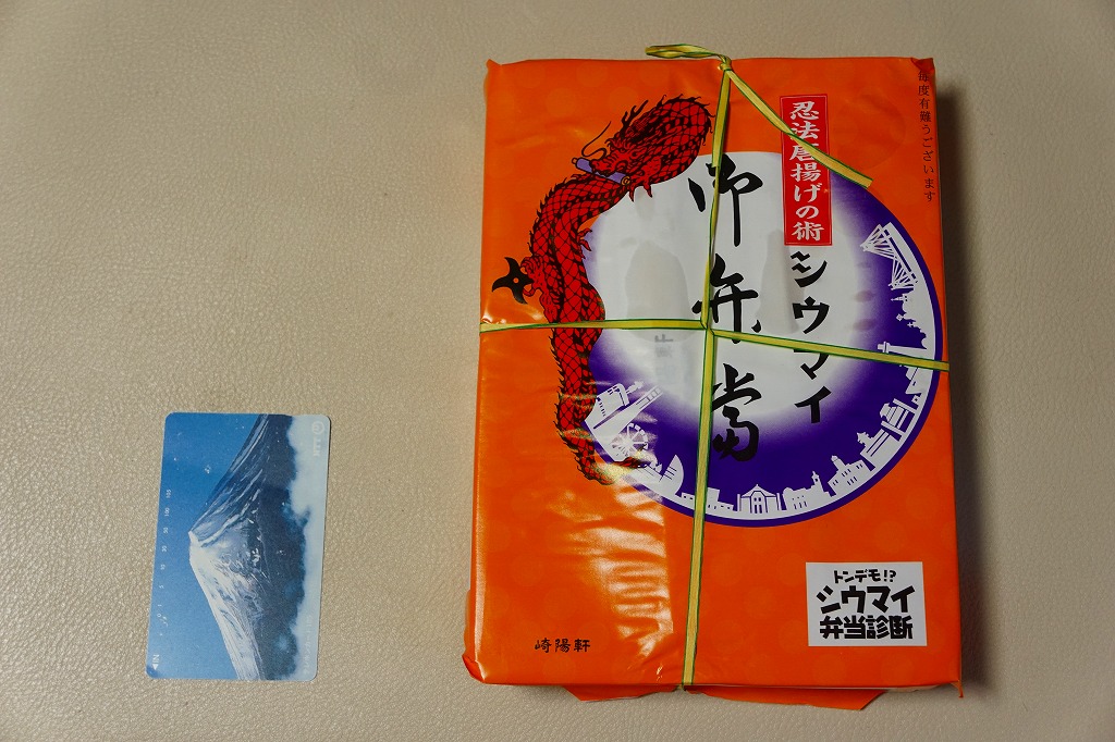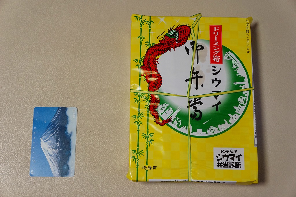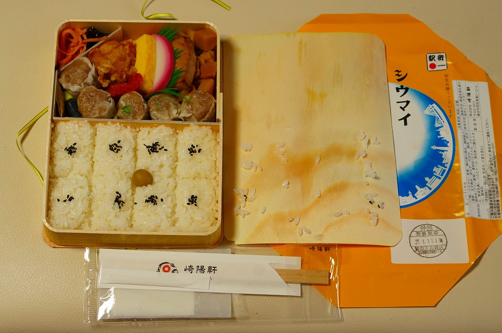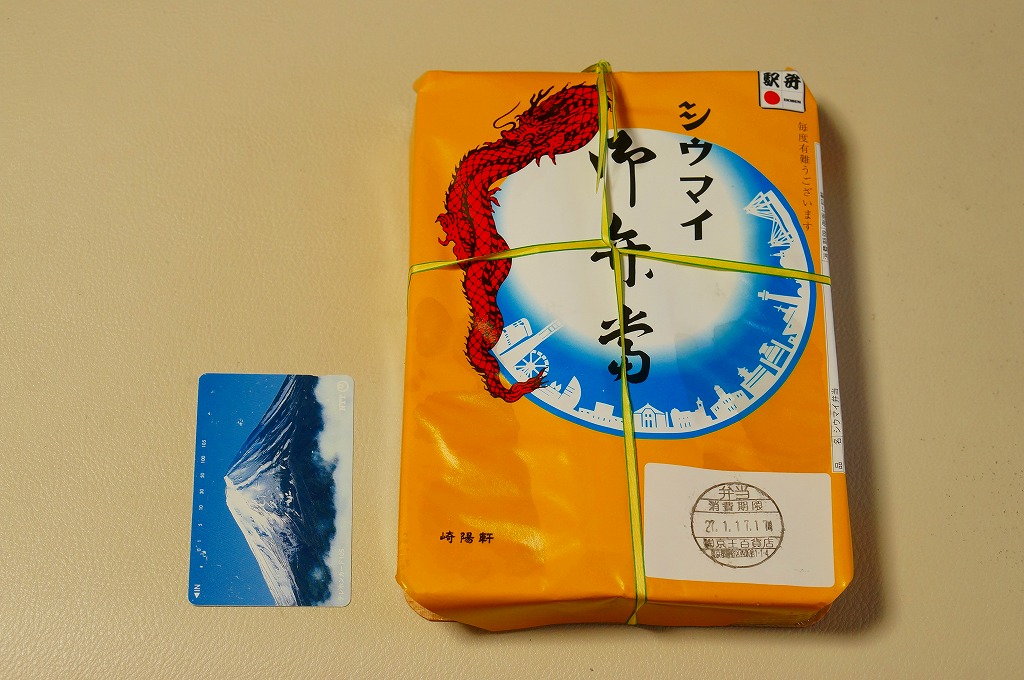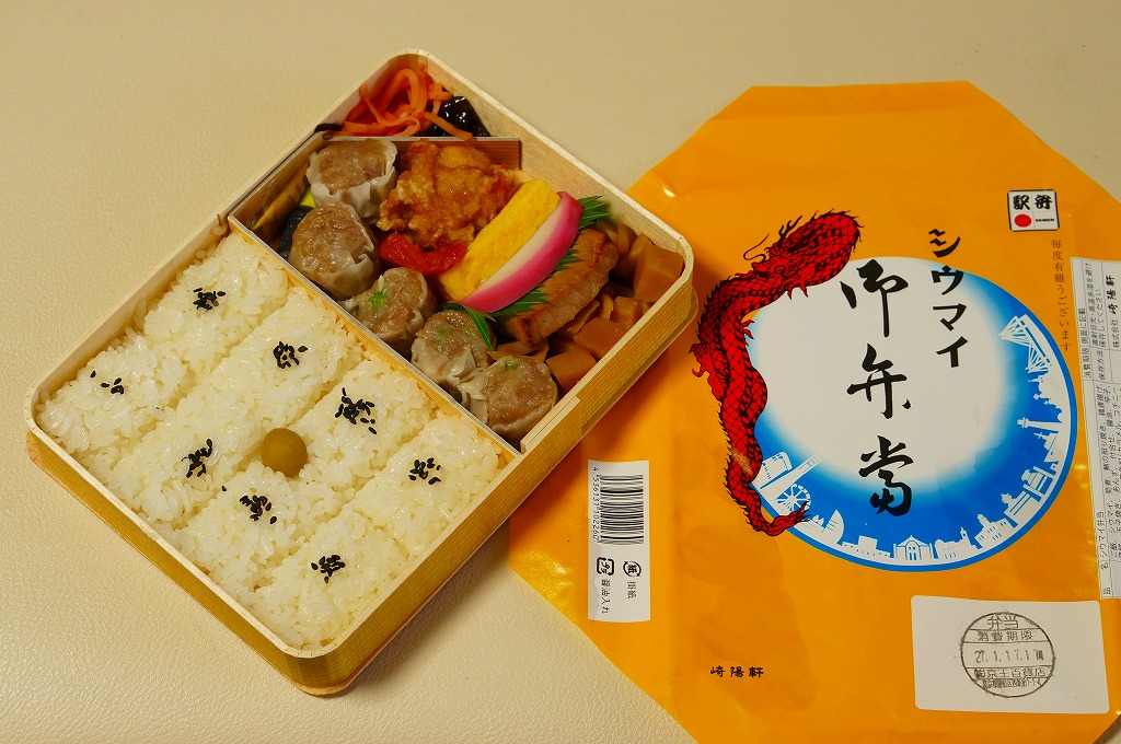 2015(平成27)年1月の、東京都新宿での京王百貨店の駅弁大会で購入した、横浜駅弁のシウマイ弁当。見た目も味も通常版と同じだが、これはデパートの催事場で実演販売されたもの。ということで、掛紙に消費期限の印字がなく、百貨店の名前で調製印が押された。