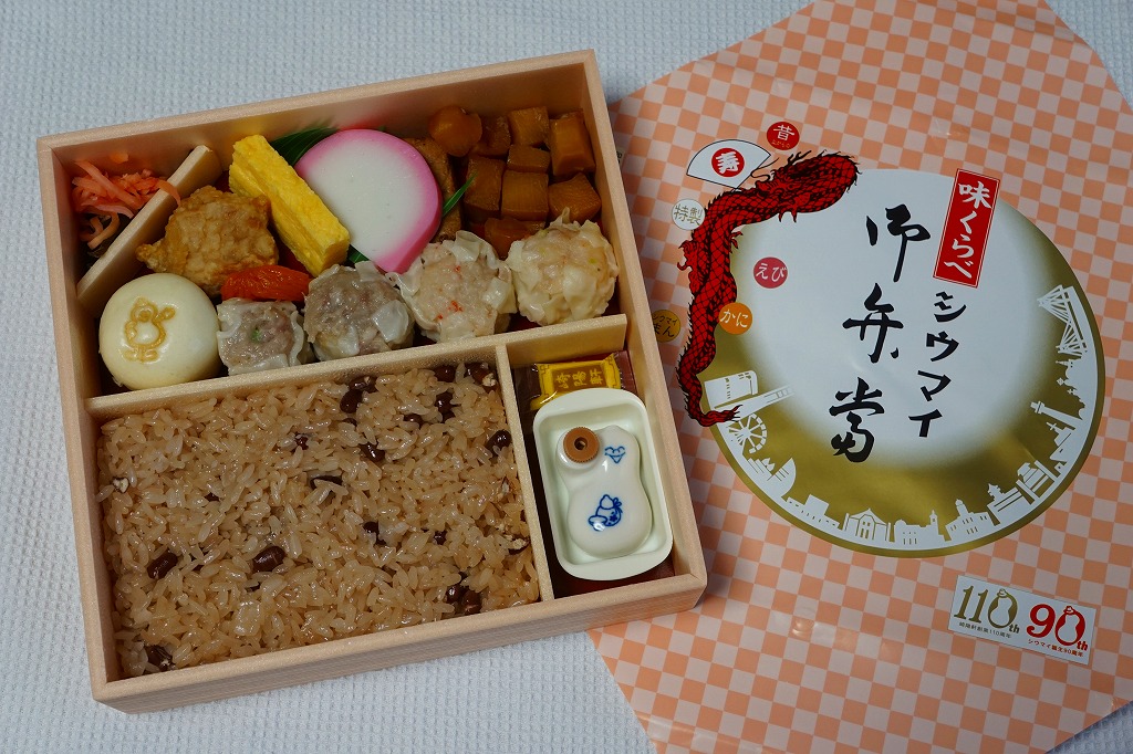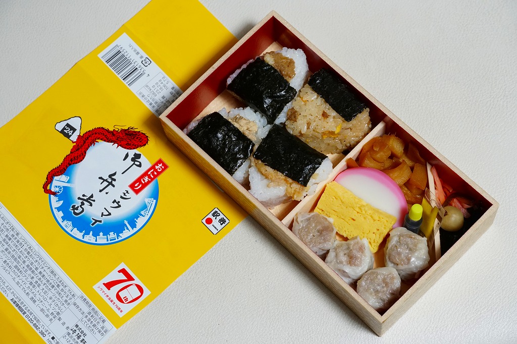 掛紙の絵柄は、普段のシウマイ弁当と同じ感じ。中身は前年と同じで、シウマイの肉あんおにぎり、鮪の燻マヨ和えおにぎり、鶏の唐揚げとあんずのガーリックバター風味おにぎり、炒飯おにぎりで4種各1個のミニおにぎりと、小梅、かまぼこ、玉子焼、筍煮、紅生姜と昆布煮、醤油と洋辛子、昔ながらのシウマイ4個。今までも普段のシウマイ弁当より高かった価格は、さらに140円も値上げされたが、予約して買う人はきっと値段を気にしないと思う。