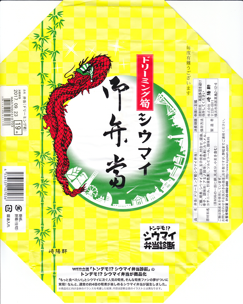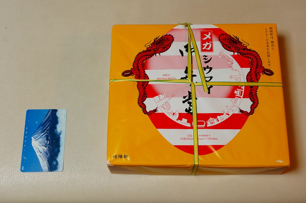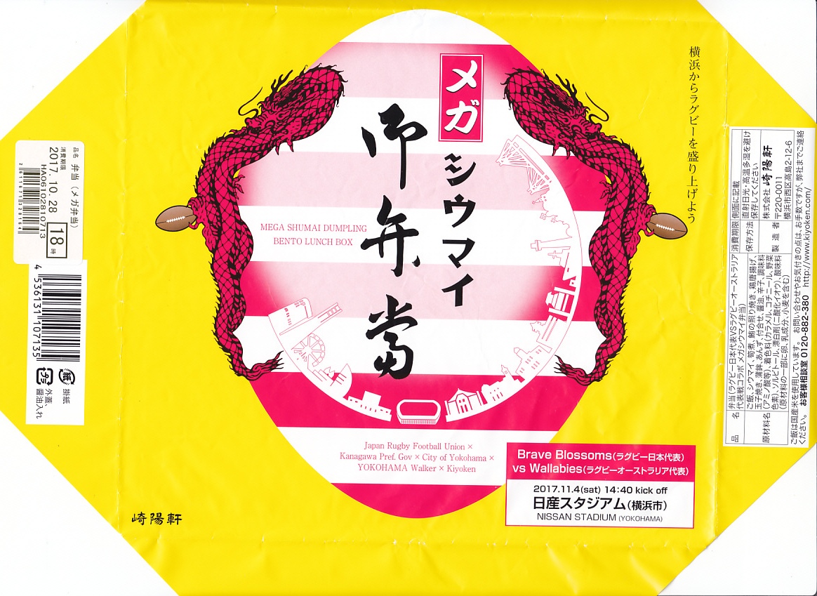 2017(平成29)年10月28日に購入した、横浜駅弁の掛紙。上記の駅弁「メガシウマイ弁当」が、わずか3か月で早くも復刻販売。11月4日のラグビー日本代表の試合にタイアップし、10月27日から試合当日まで販売された。そのため掛紙にその事実が書かれたり、龍がラグビーボールをつまみ、シルエットに日産スタジアムが追加されている。中身は変わらない。