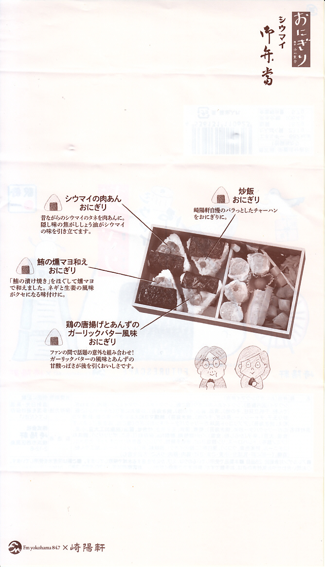 掛紙の表面には、ラジオ局が入居するビルや番組の出演者などのイラストとおにぎりを描き、裏面には写真付きで中身と宣伝文を掲載する。中身はシウマイの肉あんおにぎり、鮪の燻マヨ和えおにぎり、鶏の唐揚げとあんずのガーリックバター風味おにぎり、炒飯おにぎりで4種各1個のミニおにぎりと、小梅、かまぼこ、玉子焼、筍煮、紅生姜と昆布煮、醤油と洋辛子、昔ながらのシウマイ4個。その内容のほとんどは、シウマイ弁当から来ている。入荷前の売店に列び待ち構えていないと買えなかった人気も、シウマイ弁当より高価かつ少量で、まあ記念商品といったところ。